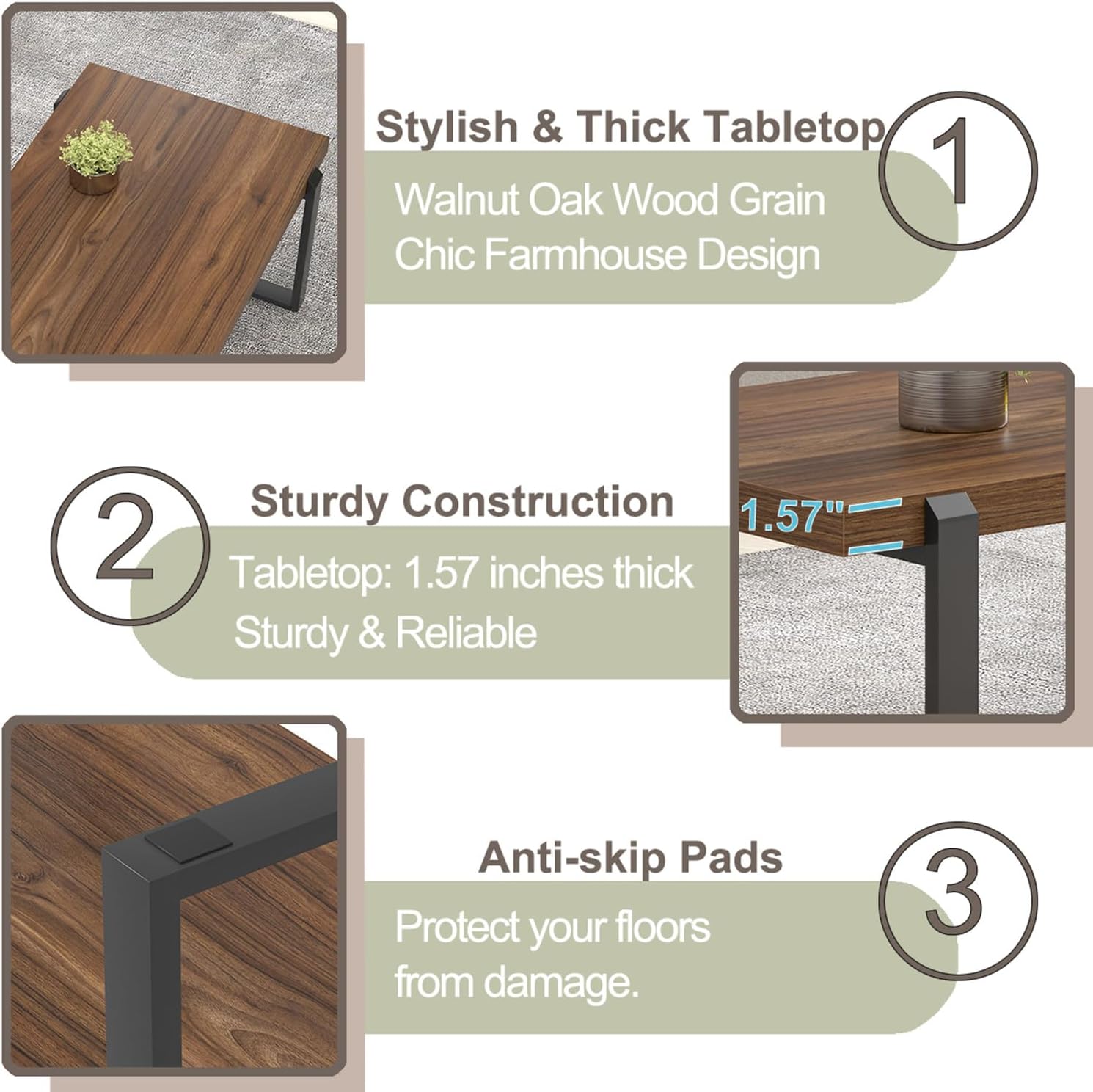 - Sturdy Construction: Crafted with a 1.57" thick tabletop and reinforced by a strong metal frame, this wood coffee table supports up to 300 lbs. Its solid build ensures long-lasting stability, making it a reliable and stylish addition to any living space.