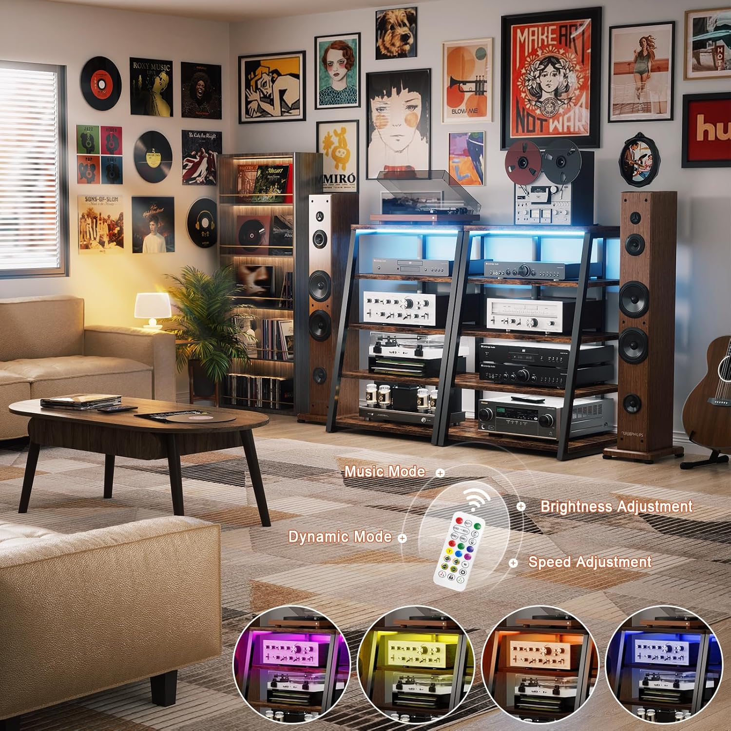 Armocity 5-Tier AV Media Stand with Power Strips, Media Console with LED Lights, Audio Tower Rack with Adjustable Shelves, Stereo Stands and Racks, 40.8'', Rustic Brown