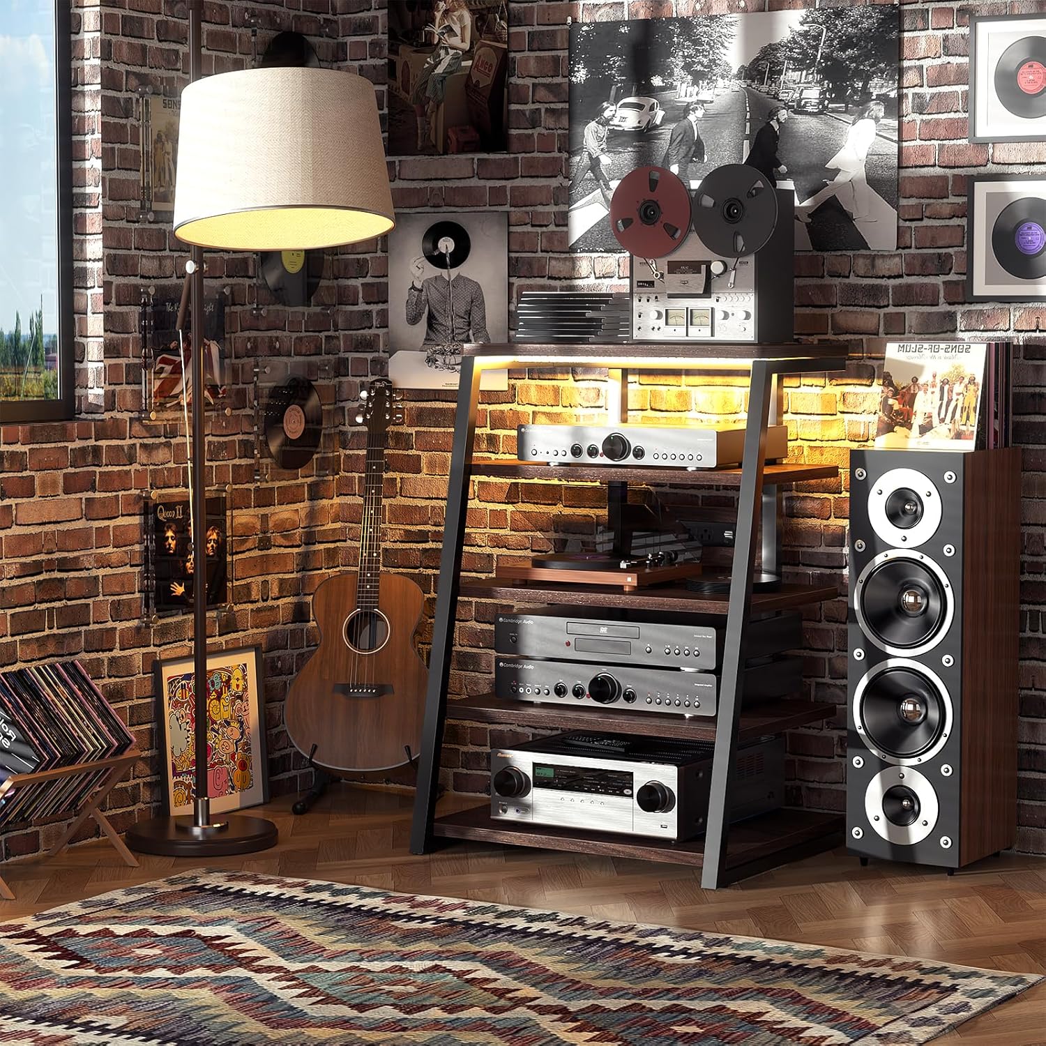 armocity 5-Tier AV Media Stand with Power Strips, Media Console with LED Lights, Audio Tower Rack with Adjustable Shelves, Stereo Stands and Racks, 40.8'', Black Walnut