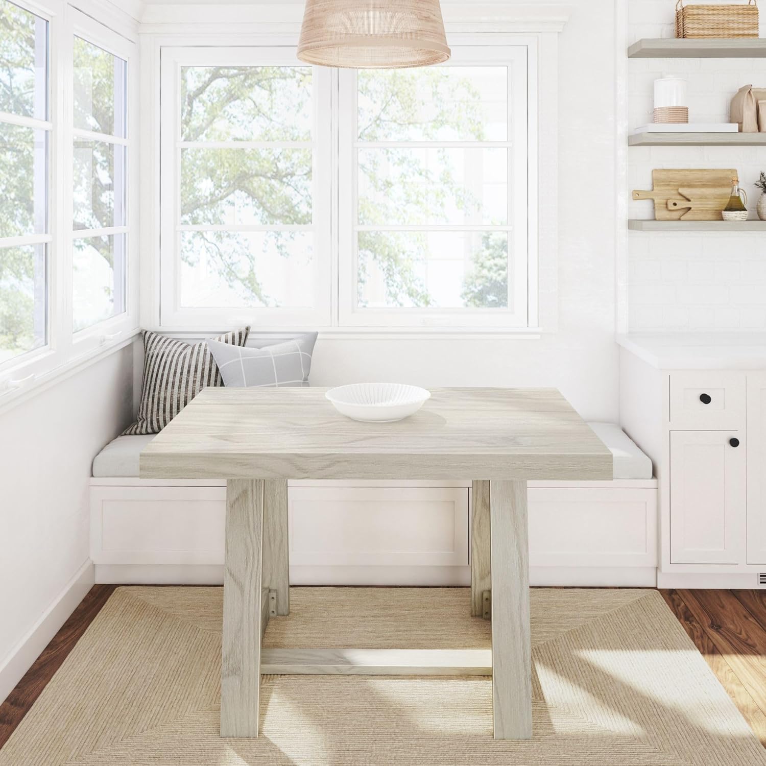 Plank+Beam 48 Inch Farmhouse Dining Table, Rustic Solid Wood Kitchen Table, Dinner Table for Dining Room, Home Office Furniture, White Sand Wirebrush