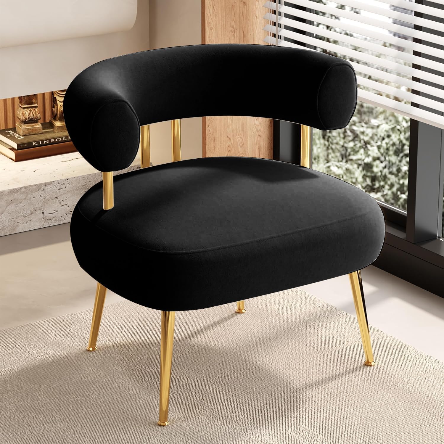 Modern Velvet Accent Chair, Round Upholstered Barrel Armchair for Small Spaces, Fluffy Side Corner Sofa Chair for Living Room, Bedroom, Vanity, Office, Reading Nook(Black)