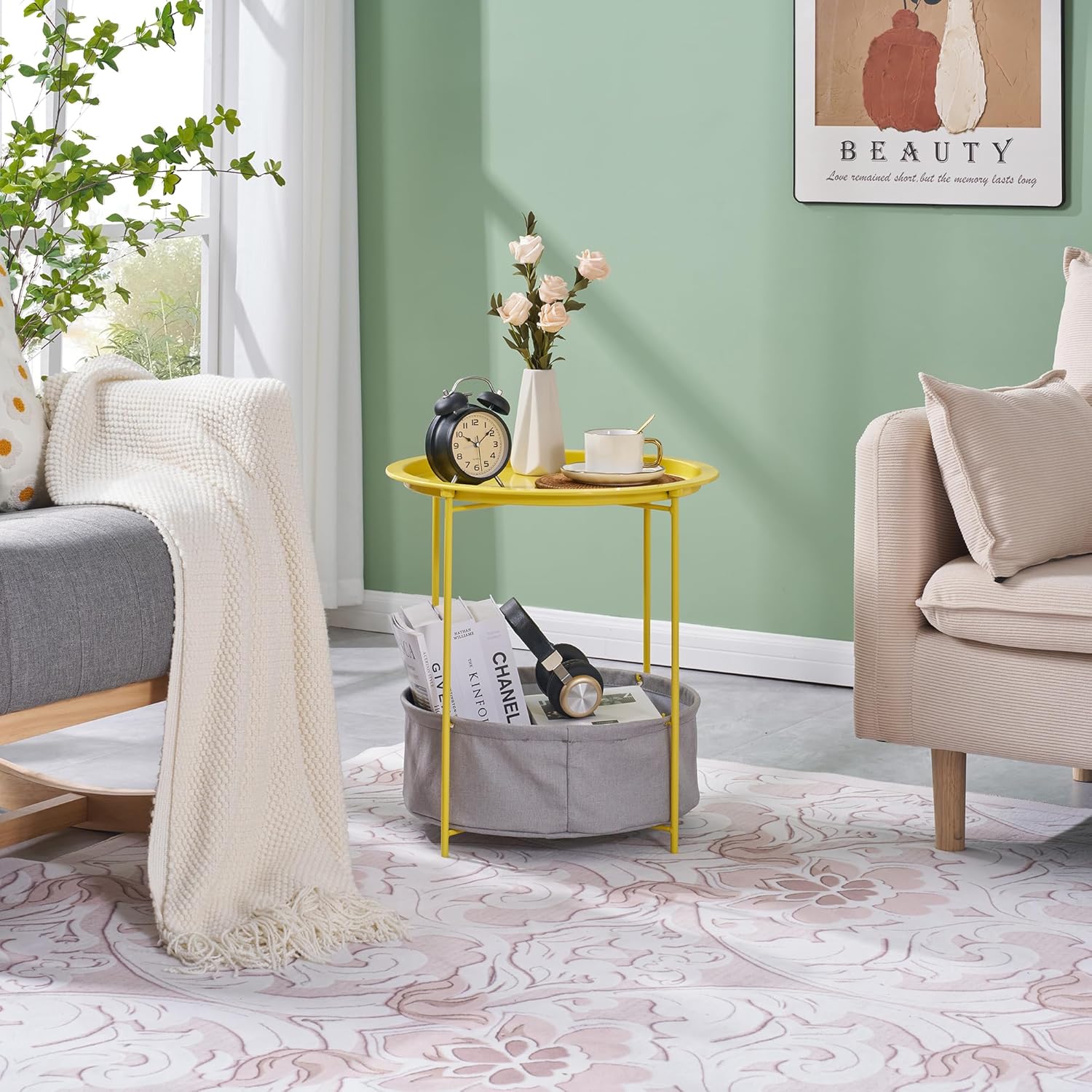 - Metal Round Side Table with Removable Storage Basket:Both the storage basket and tray top of this round side table are removable, offering versatile functionality that simplifies your life. The plug-in structure of the tray and stands requires no screws or tools for assembly, making setup effortless.