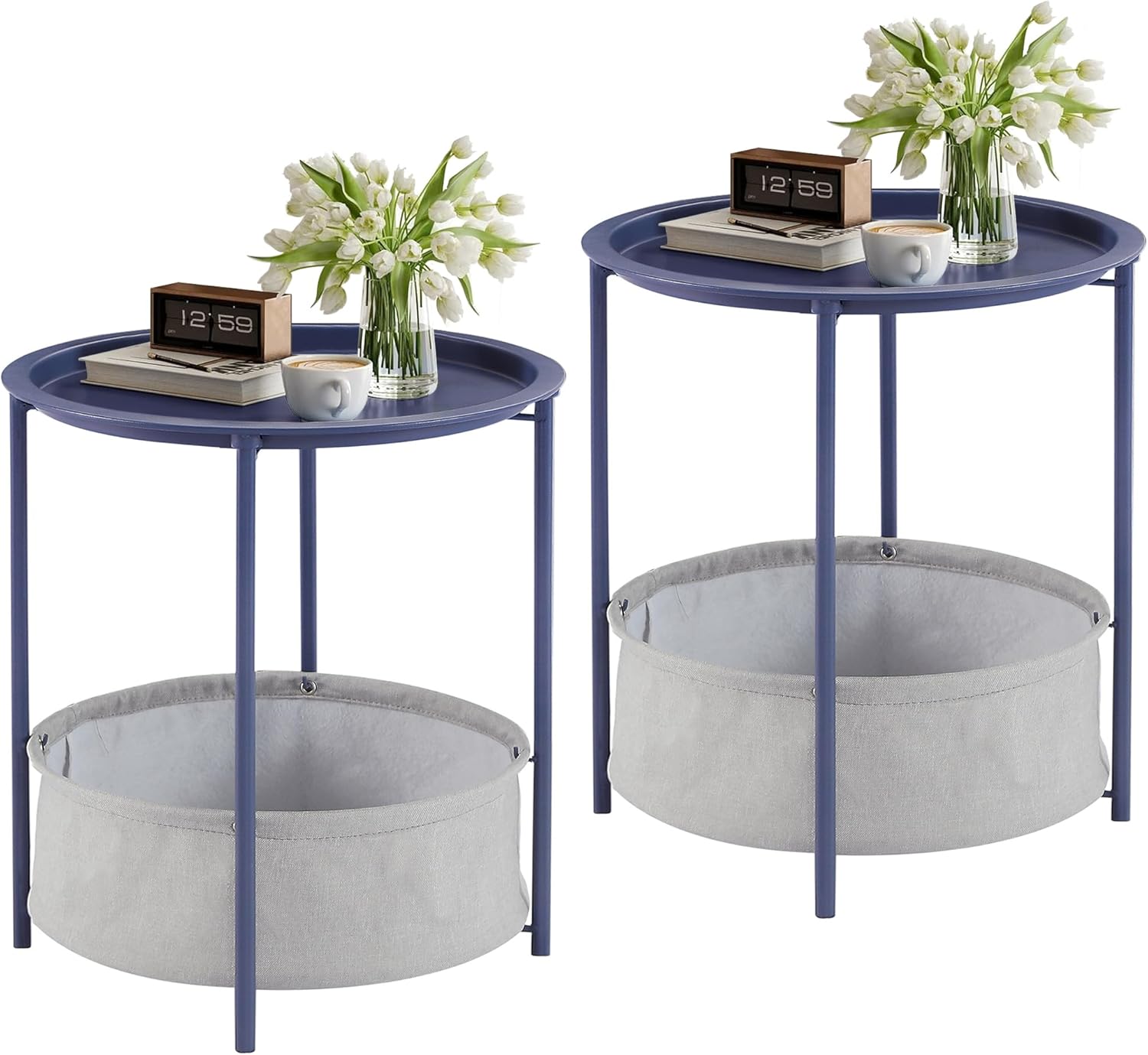 VECELO Round Side/End Table with Fabric Storage Basket,Metal Anti-Rust and Waterproof Small Bedside Nightstand with Removable Tray Top for Living Room,Balcony & Laundry,Blue /2pcs with Basket