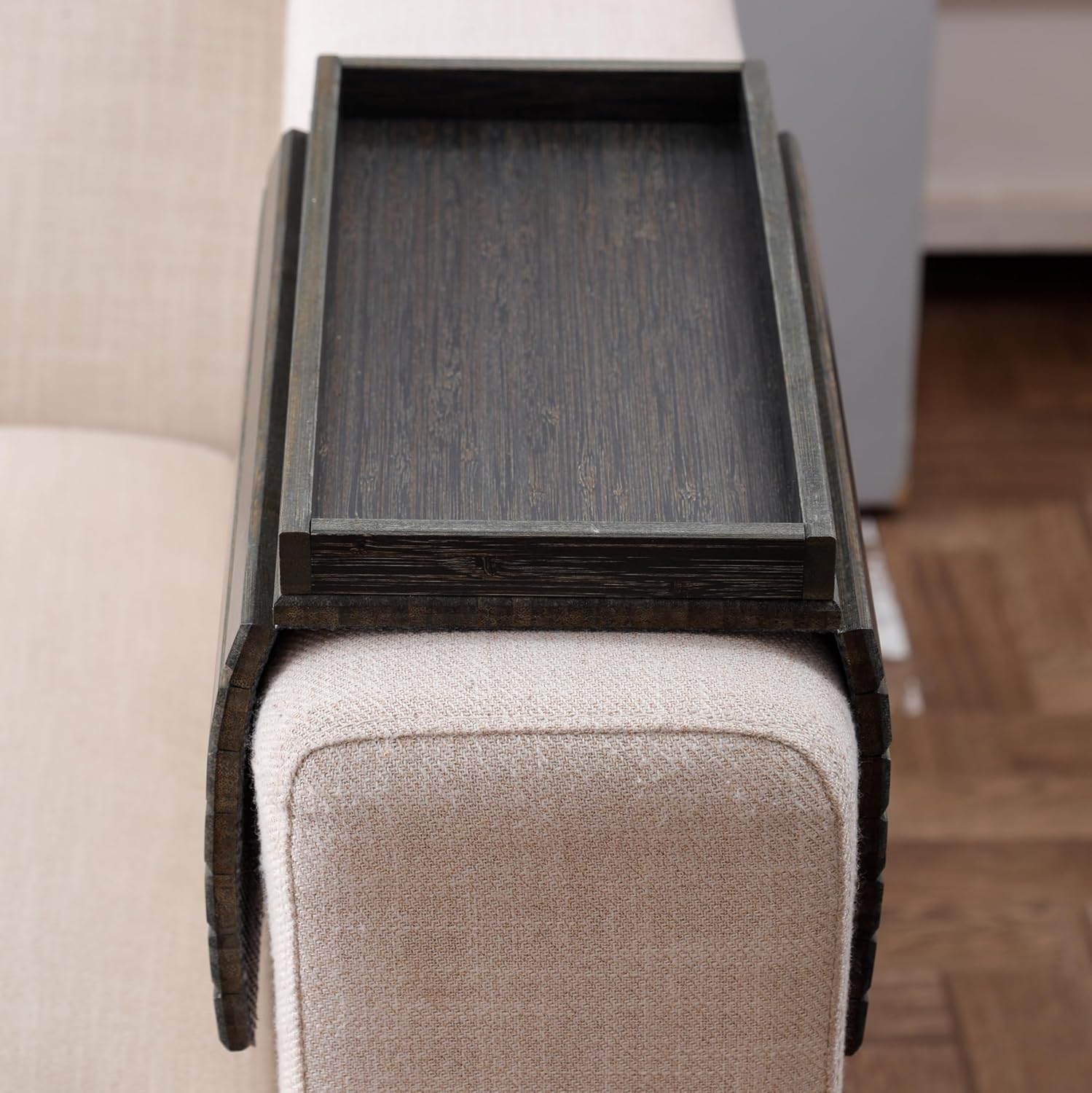 - VERSATILE USAGE: This bamboo sofa arm tray fits most straight armrests and works well on sofa cushions or ottomans. The compact design makes it a space-saving alternative to end tables or large TV trays.
