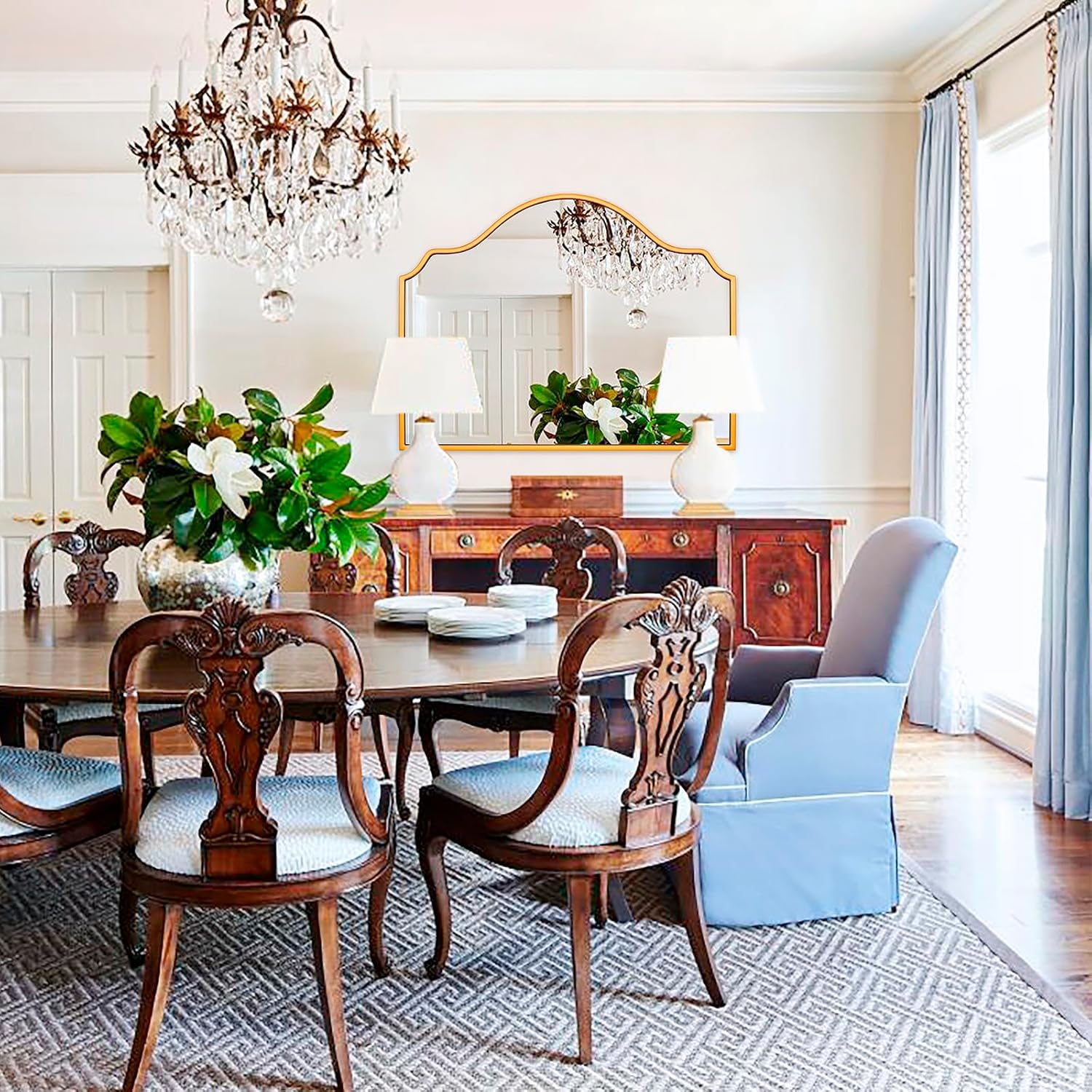 - 【Arched Design】Unique wall mirror decor with wooden frame creates antique and low profile atmosphere. Gold arched frame increases stereoscopic and sense of reality. When light shines on smooth surface adds natural shadow, give a better sense of brightness and space.