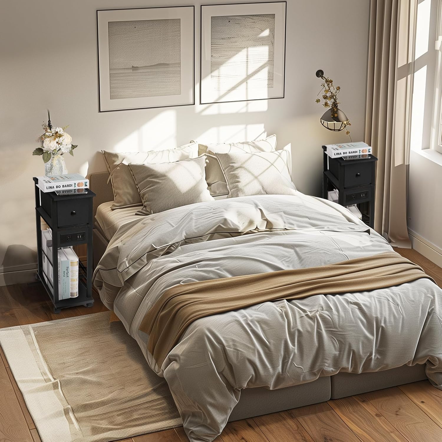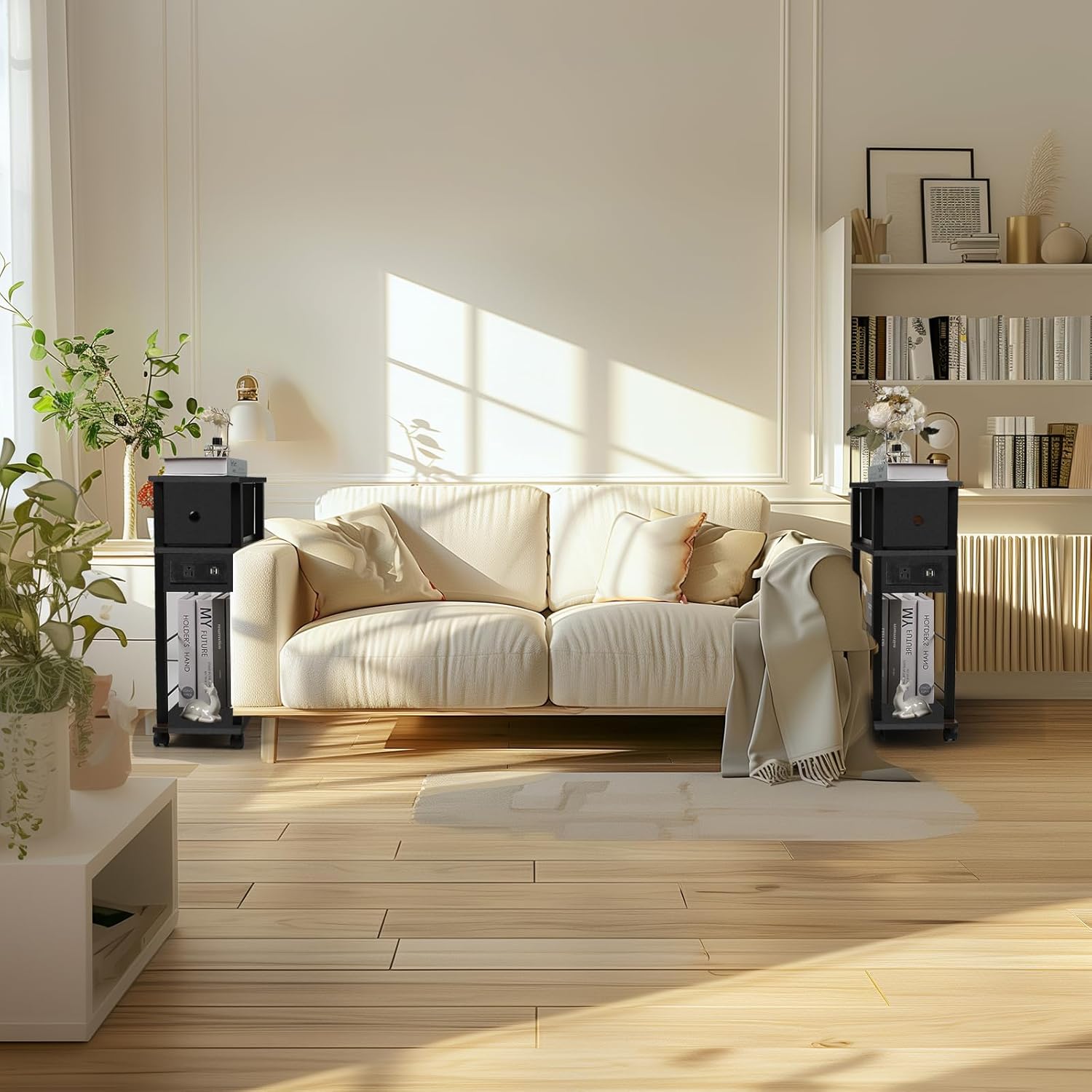 Side Table Set of 2,Side Table with Charging Station and Drawer, Narrow End Table with USB Ports and Outlets for Small Space, Living Room, Bedroom and Office, with 4 Wheels
