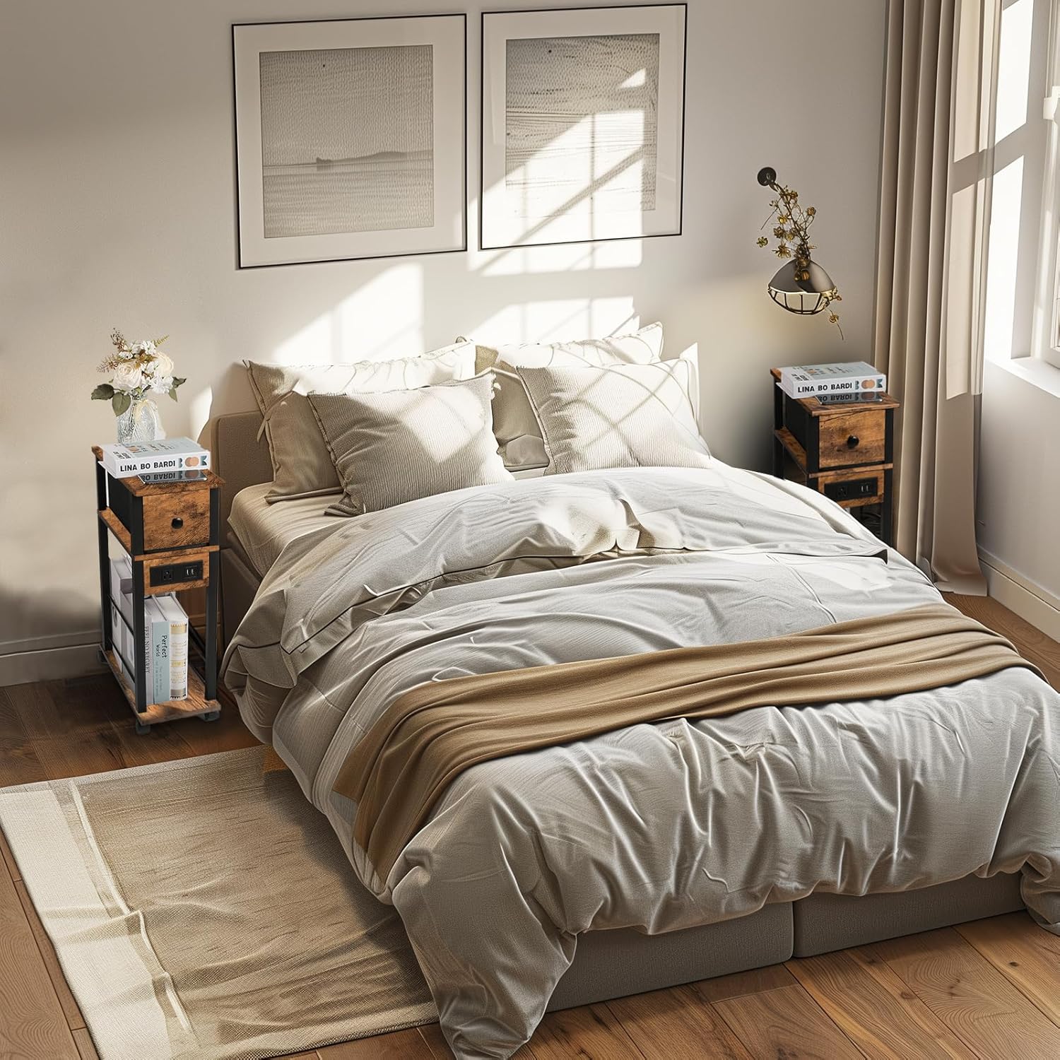 Side Table Set of 2, Side Table with Charging Station and Drawer, Narrow End Table with USB Ports and Outlets for Small Space, Living Room, Bedroom and Office, with 4 Wheels