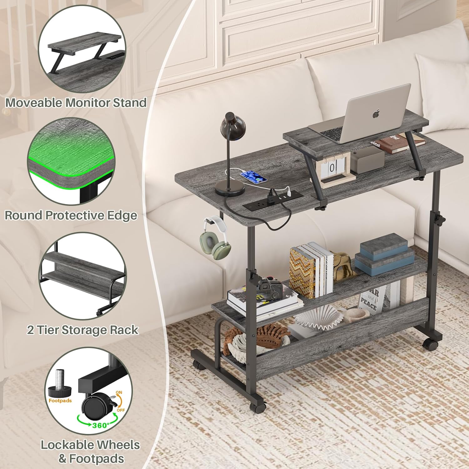 Height Adjustable Standing Desk with Power Outlets and LED Lights - 32" Manual Stand Up Desk with Monitor Stand and Storage Shelves Small Mobile Rolling Computer Desk Portable Laptop Table, Grey Oak
