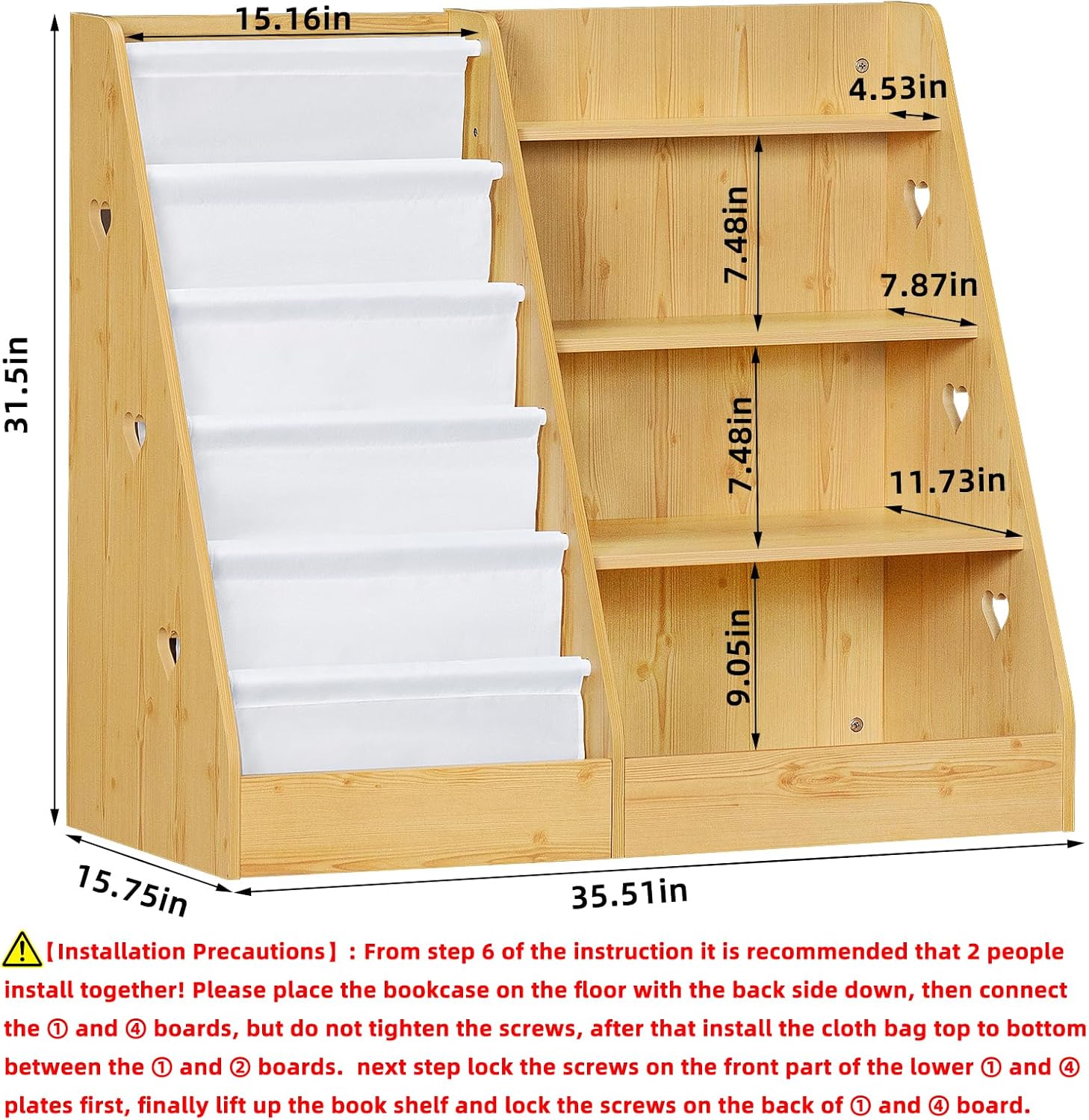 - [Carefully Designed] Dimensions :35.51 "W x 15.75 "D x 31.5 "H inches. The bookshelf for kids is uniquely designed with lovely hearts on both sides. The height is also just right, so children can easily grab and place their favorite books. No external leakage screws, the book storage whole is very beautiful. The rounded design of the edges will prevent your child from being bumped. It adopts strong materials and a child-safe design. Our kids bookcase is suitable for daily use by children.