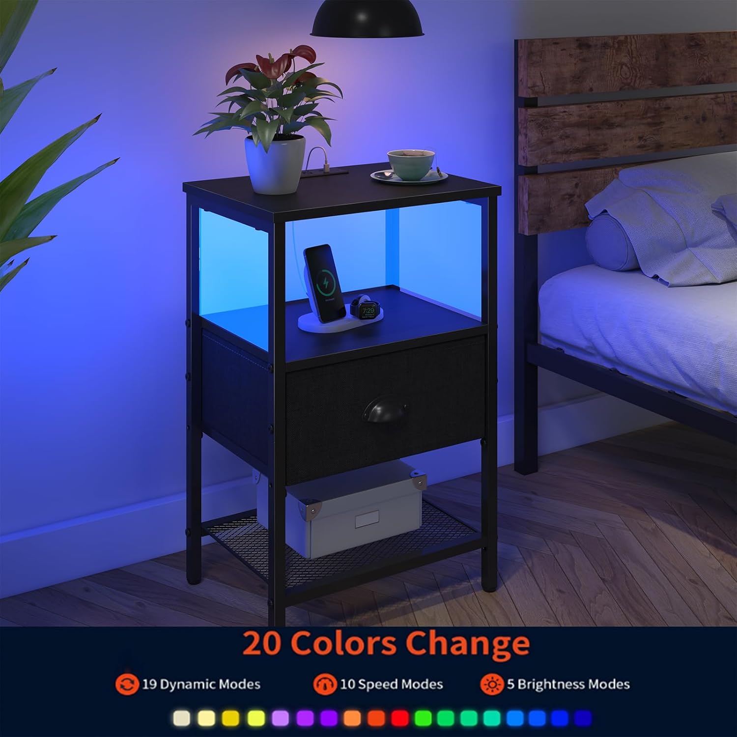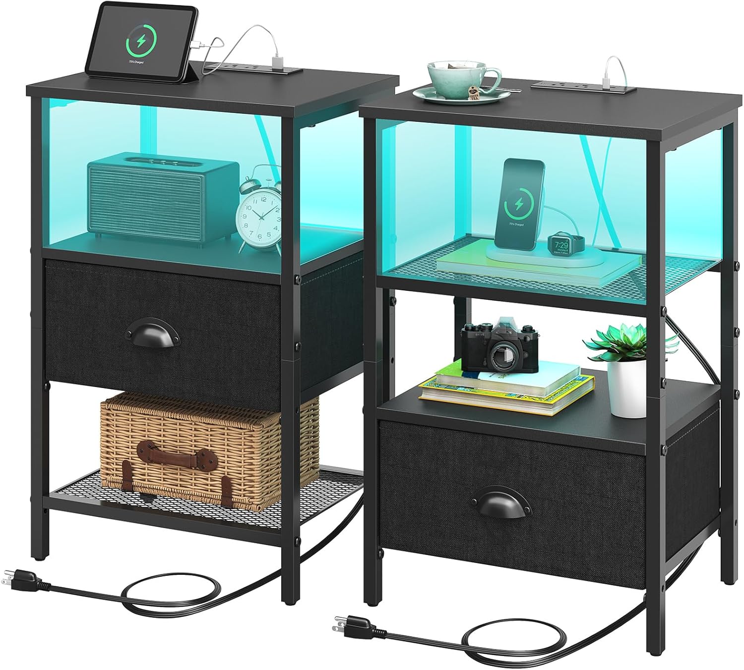 Sthmec Nightstands Set of 2, LED Bedside Tables with Charging Station and Fabric Drawer, Night Stand with Storage, 3 Tier Side Table with Open Shelf, LED Nightstand with Charging Station, Black