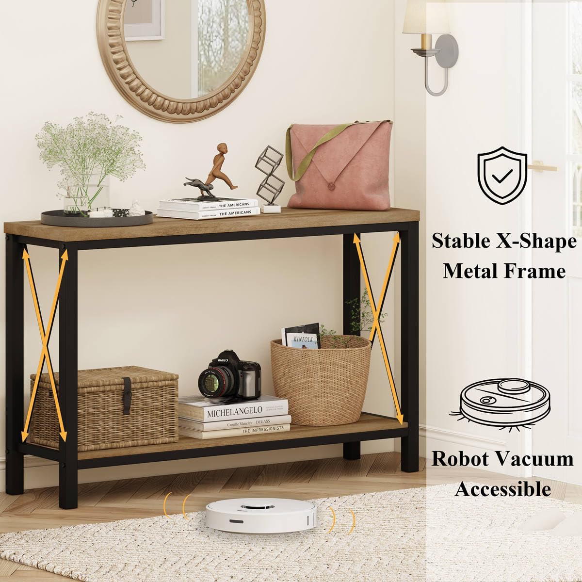 - Ideal Dimensions - Measuring 47.24"W x 13.39"D x 30.12"H, this rustic console table fits perfectly in any living area. With a ground clearance of 4.09 inches, the bottom shelf is designed to accommodate robotic vacuums, making cleaning easier. Use it as an entryway storage table, a console for the living room, a stylish TV stand, or a two-tier bookshelf for your favorite books.