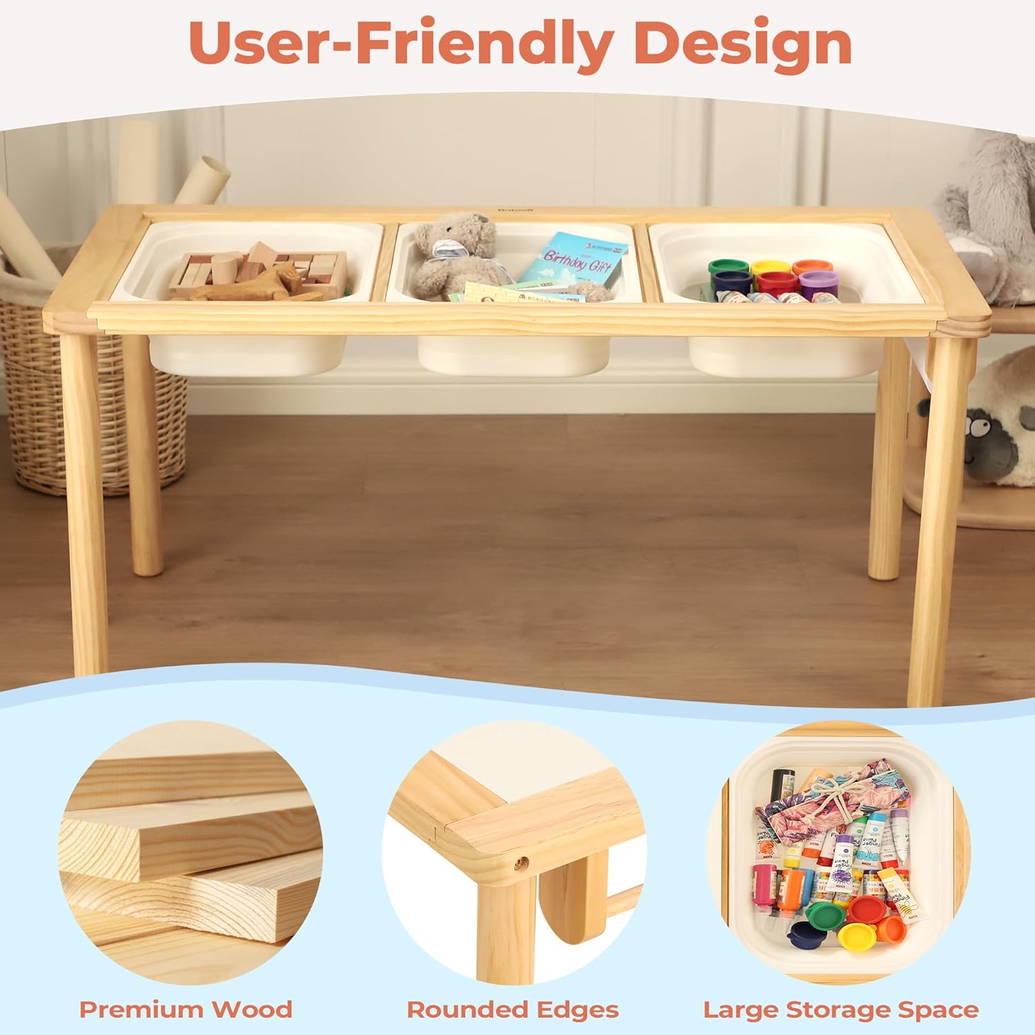 - VERSATILE SENSORY TABLE FOR TODDLERS: This versatile toddler activity table features a removable double-sided board, 3 spacious bins, and a unique hollow-out design that can be used for modeling or craft displays. It’s ideal for sand and water play, drawing, building blocks, and snack time—perfect for both indoor and outdoor fun.