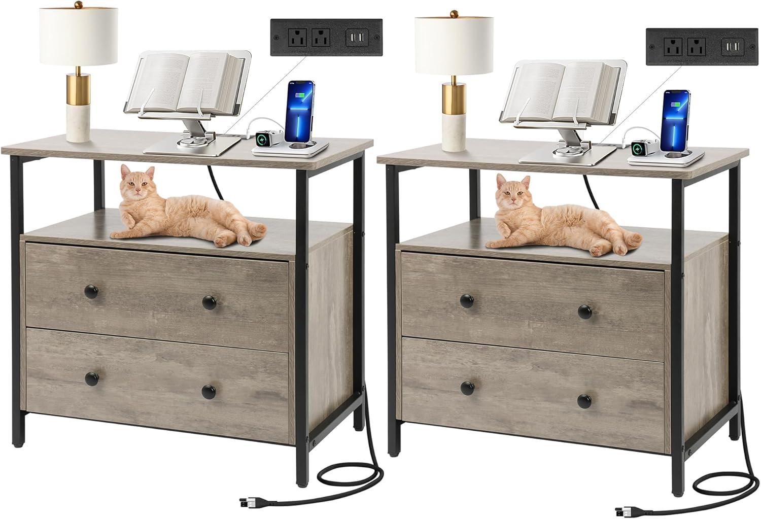 27 inch Wide Nightstand with Charging Station, Bedside Table with Open Shelf, 2 Drawers Small Wood Dresser, End Side Table for Bedroom (2 Pack,Rustic Gray)