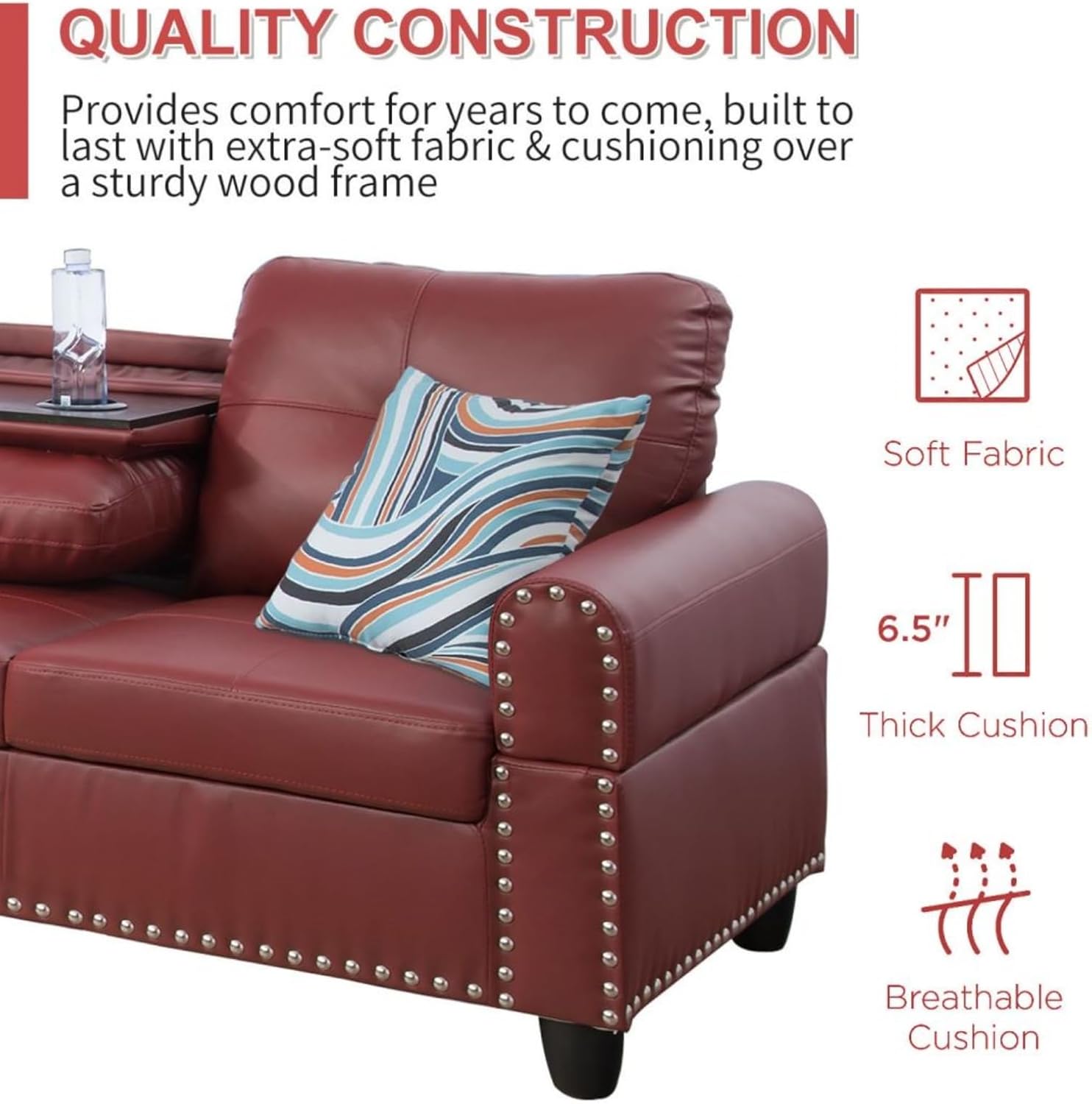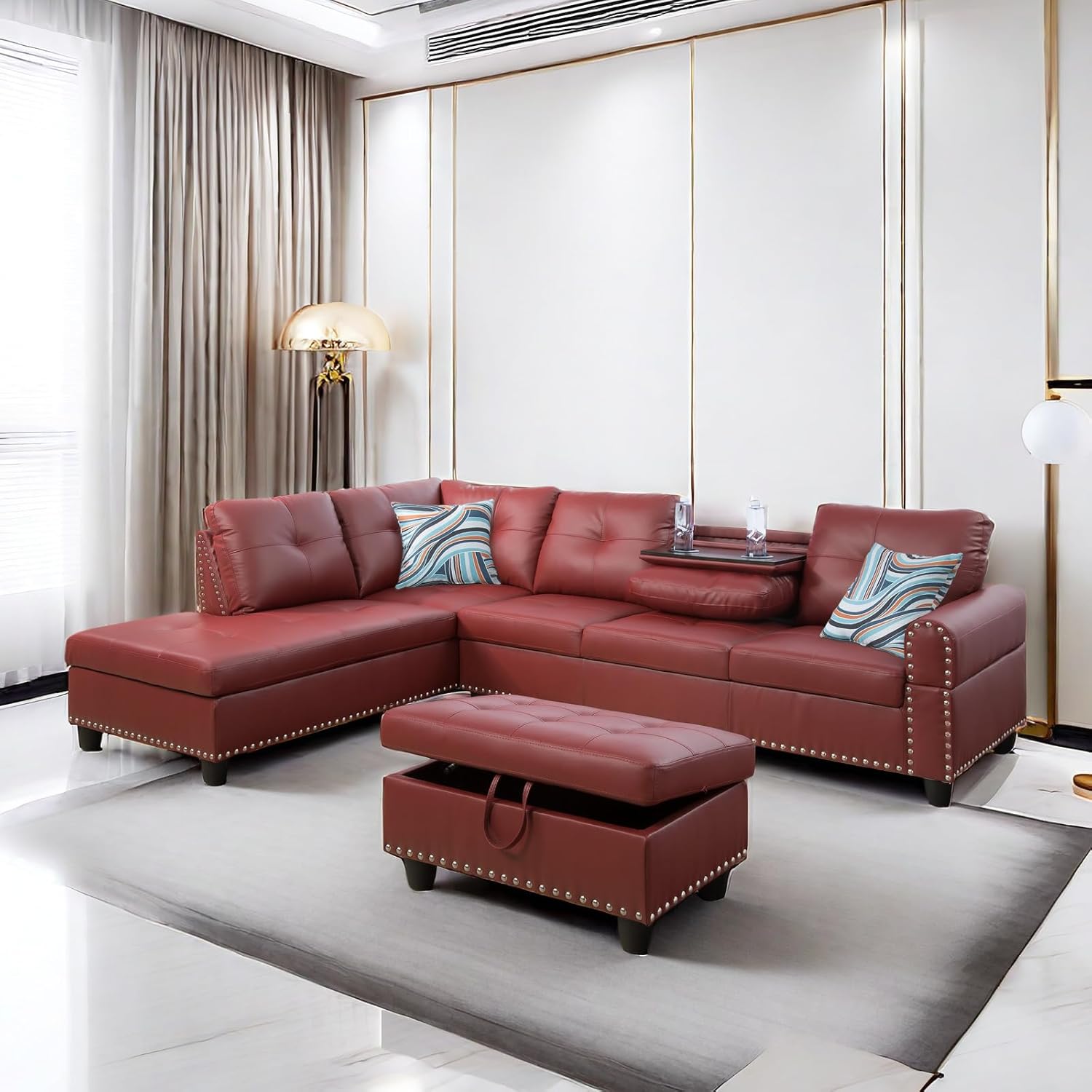 LeatherL Shaped Couch with Ottoman, Modern Nail-Head Design Comfy Sectional Sofa with Cup Holder & Chaise for Living Room, Bedroom, Office, Red