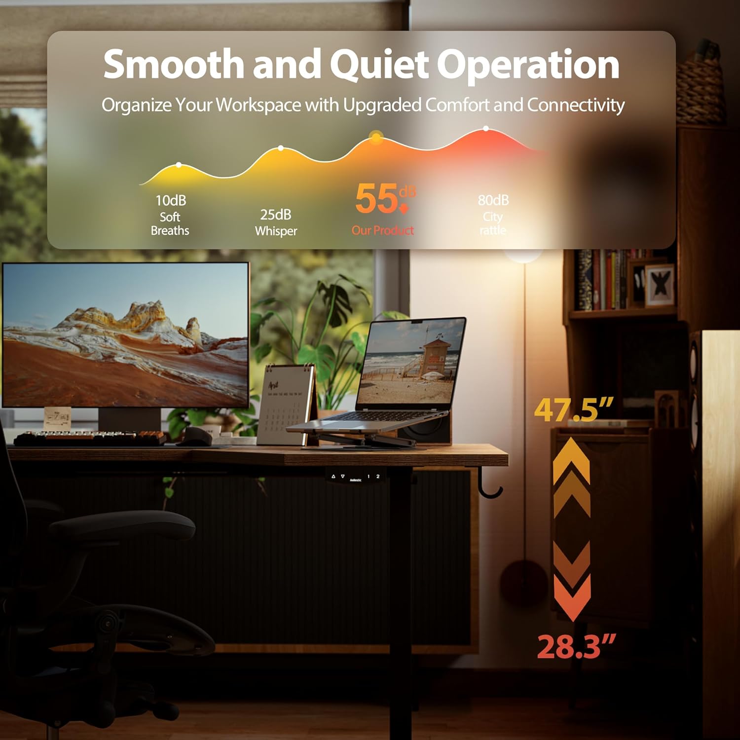 - 【Adjustable Height with Memory Presets】 Easily adjust the desk height between 28'' and 45'' with the quiet electric motor (operating below 55 dB). The ergonomic design helps reduce long-term sitting fatigue, promoting better health. Two memory buttons allow you to save and switch to your preferred heights effortlessly.