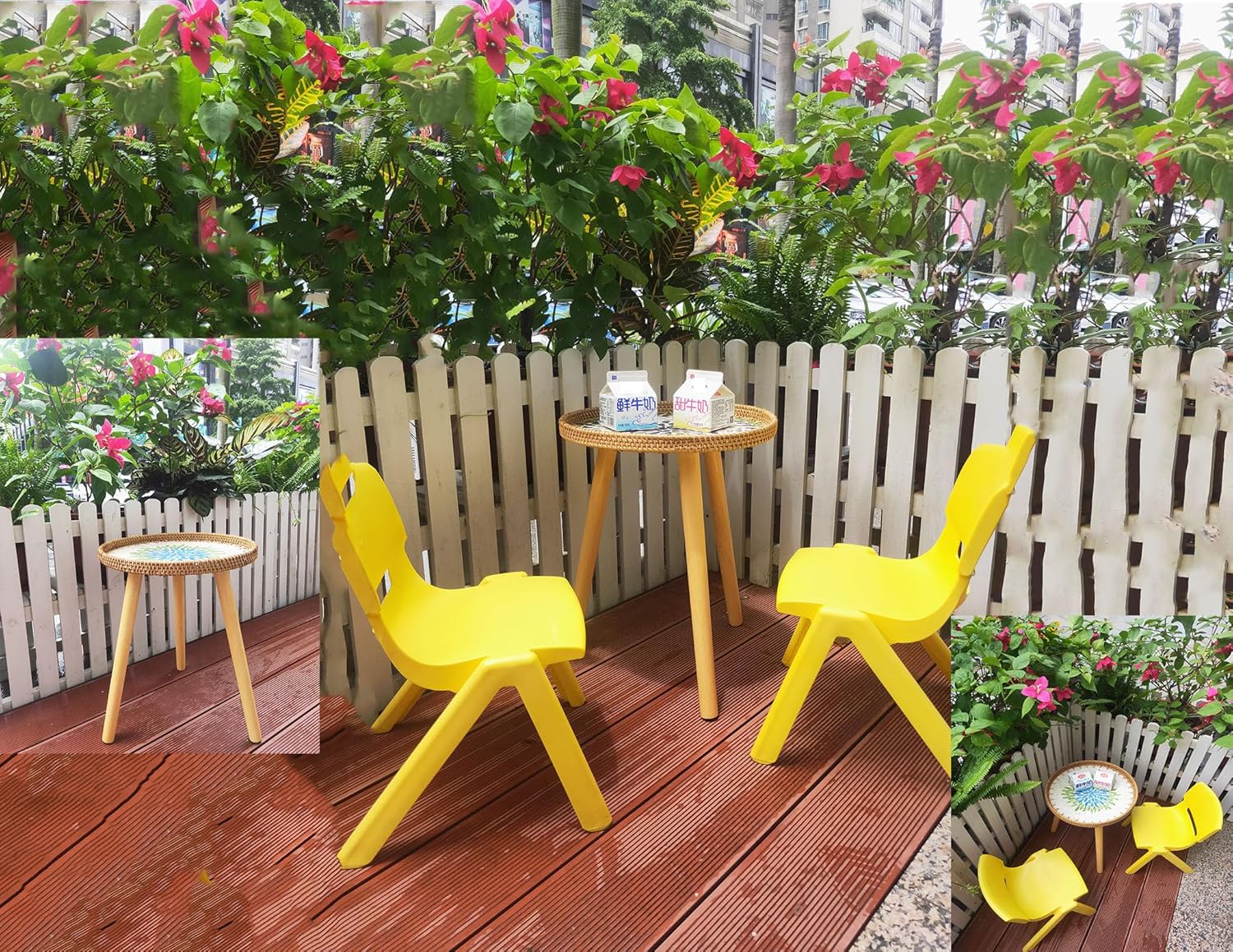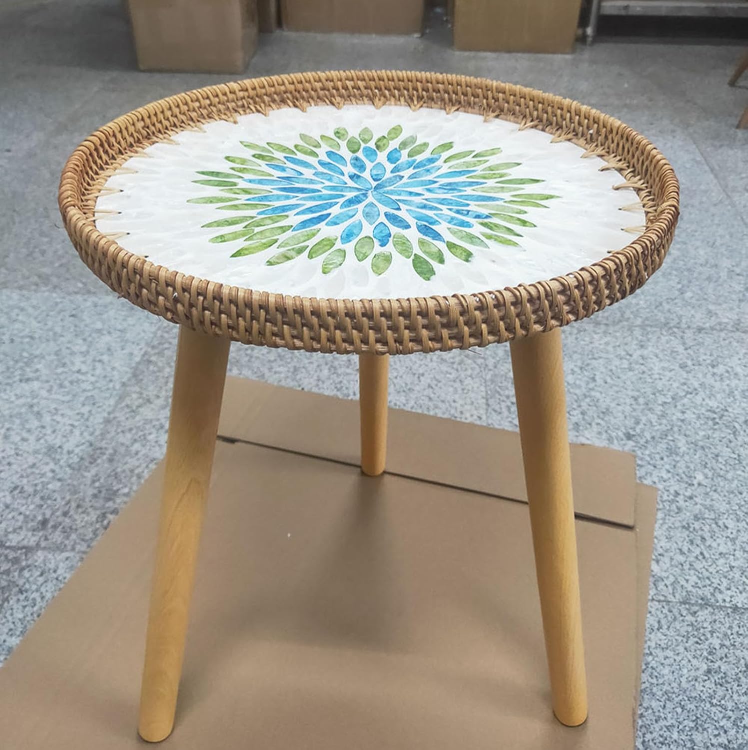 - 【Small Rattan Side Table】: Round Coffee Table has three wooden legs protected by beautiful sticker,Pallet edge protection design to prevent objects from falling.Vine edge+shell decoration desktop,overall design natural,fresh,rural retro style