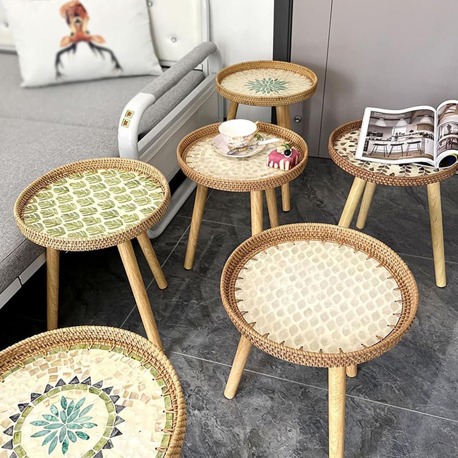- 【Creative design】: the round rattan tray with raised edges, providing ample storage space while preventing items from slipping off. The bottom of the rattan tray is adorned with cyan and white shells,creating an embossed beauty that elevates the table's overall appearance