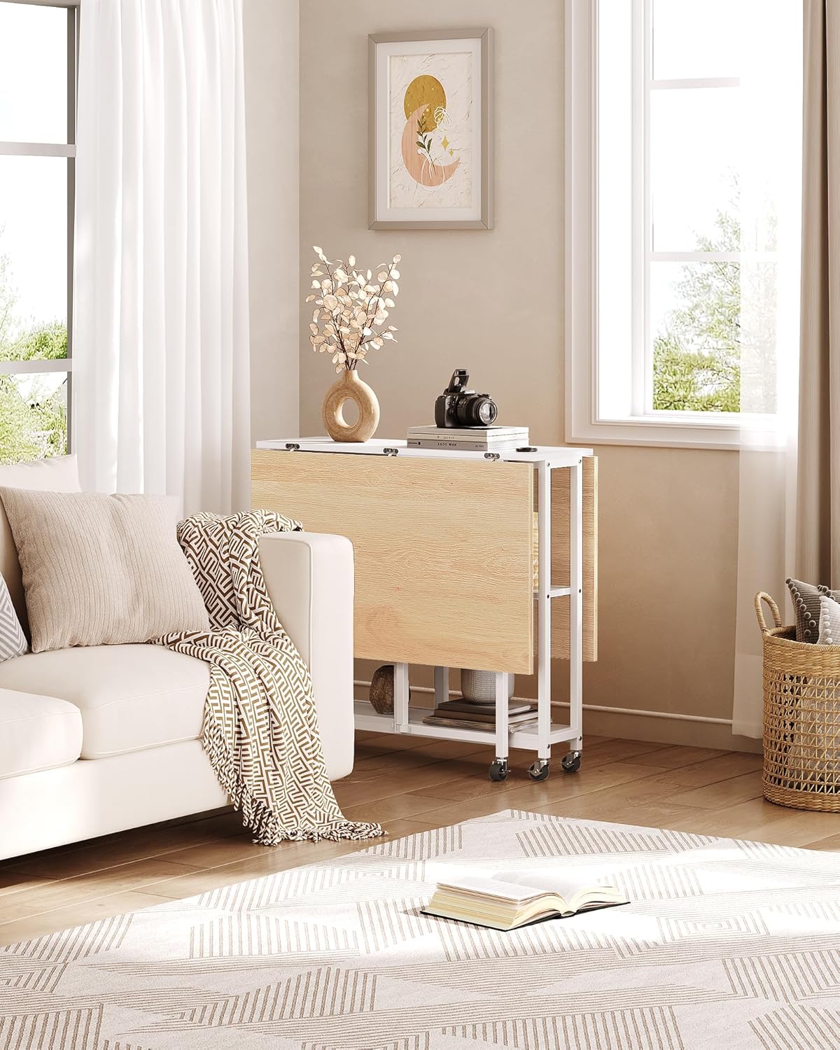 Folding Dining Table, Movable Dining Table, Kitchen Table for Small Space, Foldable and Expandable Desk Furniture with 6 Wheels, for Dining, Living Room, Apartment, White and Natural TCZ01WN