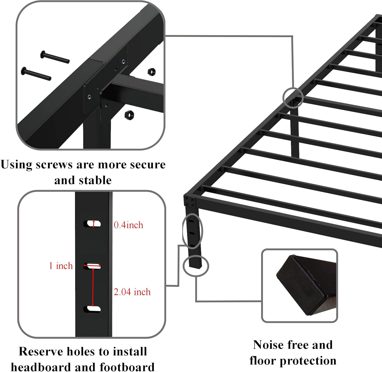 - Headboard and Footboard Compatible: You can easy to attach your own style headboard and footboard(not included) to this black metal 75"x30" bed frame where have some drilled holes on 4 legs.