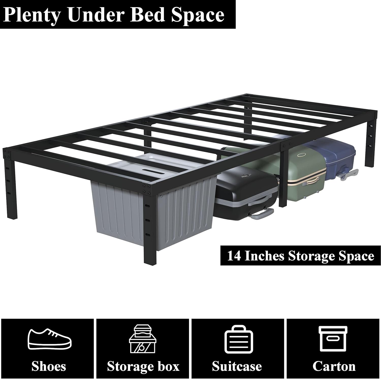 - Under Bed Storage: There are 14 inch clearance space under the bed frame. The finish installed bed frame narrow twin size: L75"*W30"*H16", and for Mattress Size: L75"*W30".