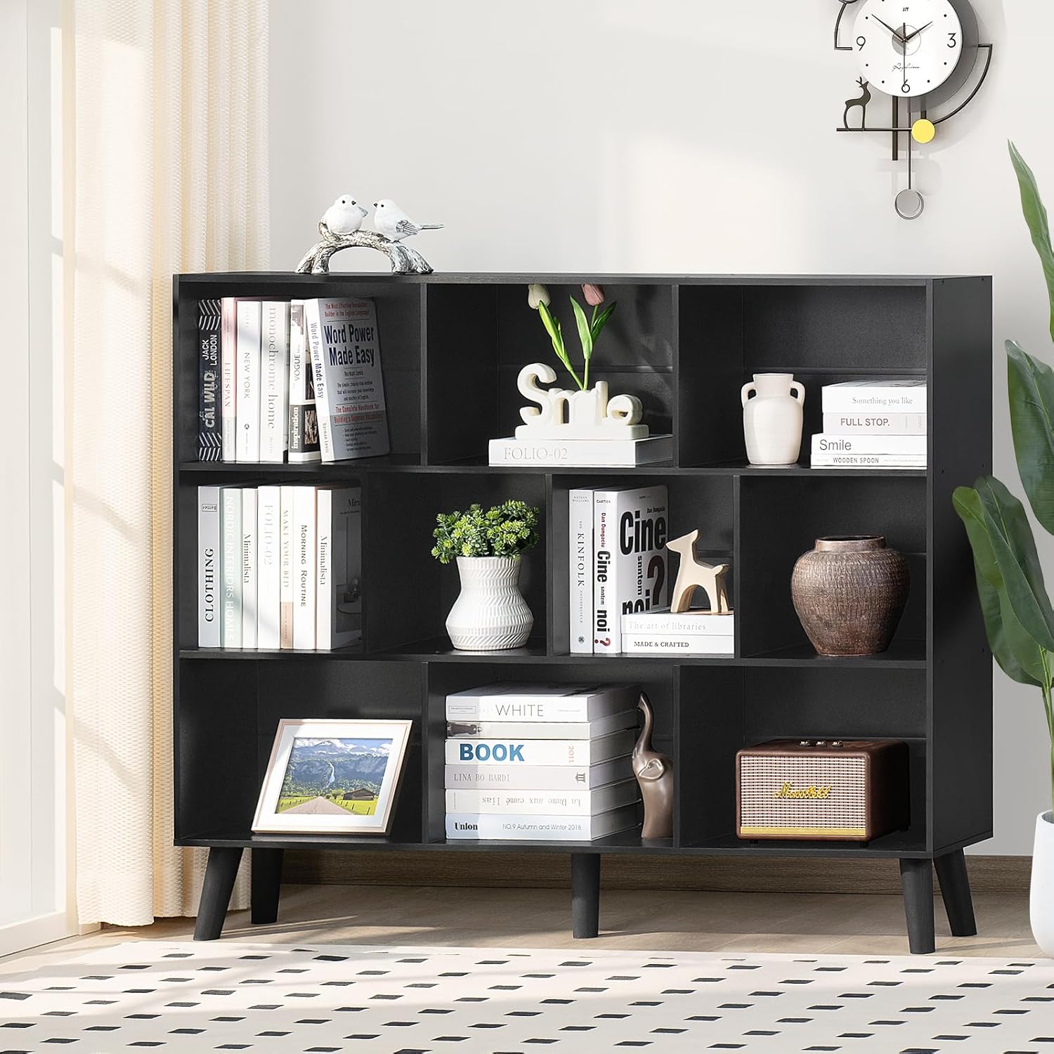 YAHARBO 10 Cube Large Bookshelf,3 Tier Bookcase with Legs,Black Mid-Century Modern Bookshelves,Wide Free Standing Open Storage Organizer Shelf,Tall Wooden Book Case Furniture for Living Room,Office