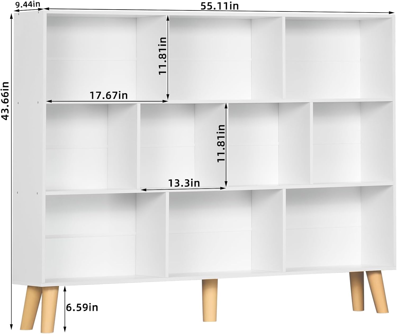 YAHARBO 10 Cube Large Bookshelf,3 Tier Bookcase with Legs,White Mid-Century Modern Bookshelves,Wide Free Standing Open Storage Organizer Shelf,Tall Wooden Book Case Furniture for Living Room,Office
