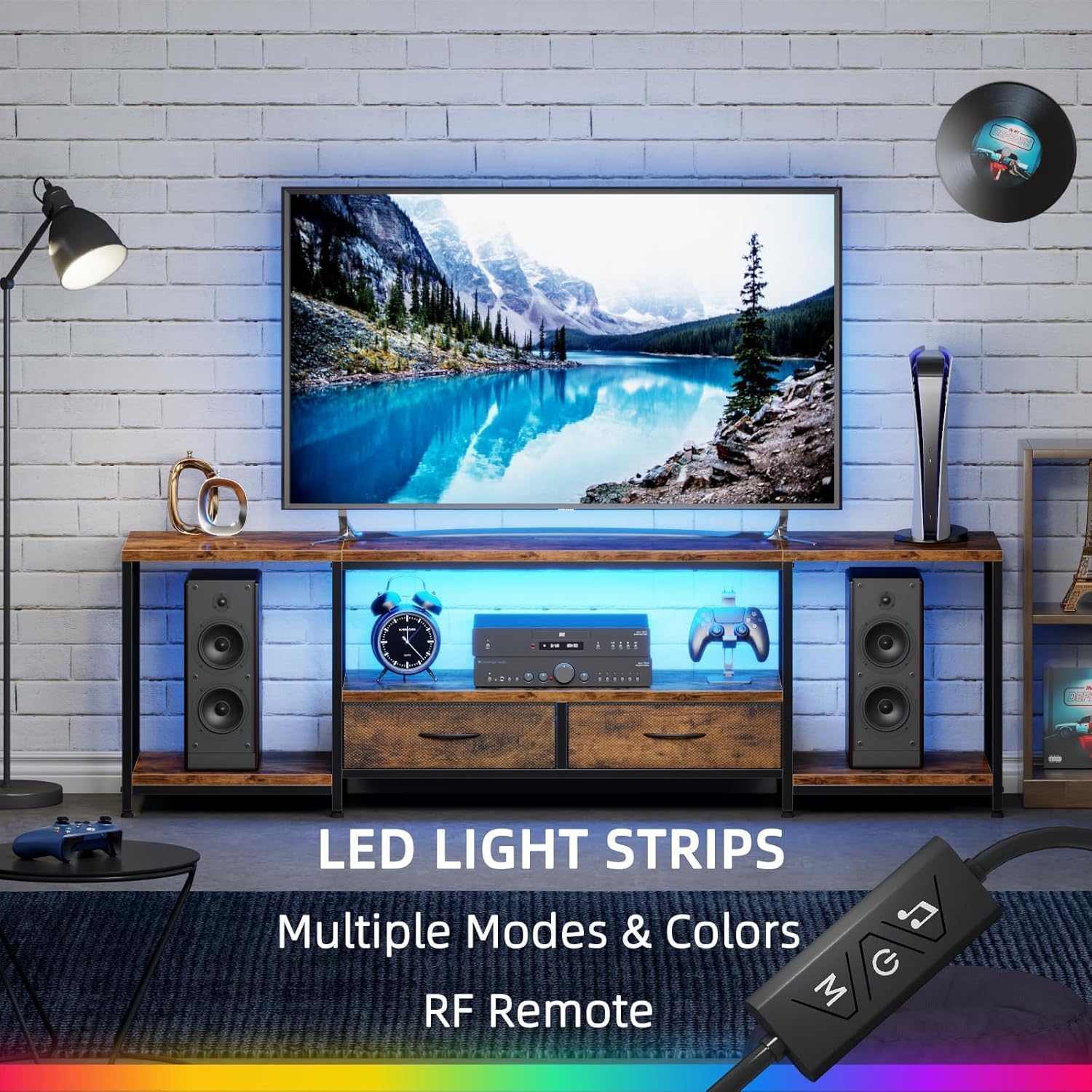 - Customizable LED Light Strips: Equipped with dynamic LED light strips, the media console allows you to create personalized atmospheres with different colors, setting the mood for any occasion, from cozy movie nights to lively gaming sessions.