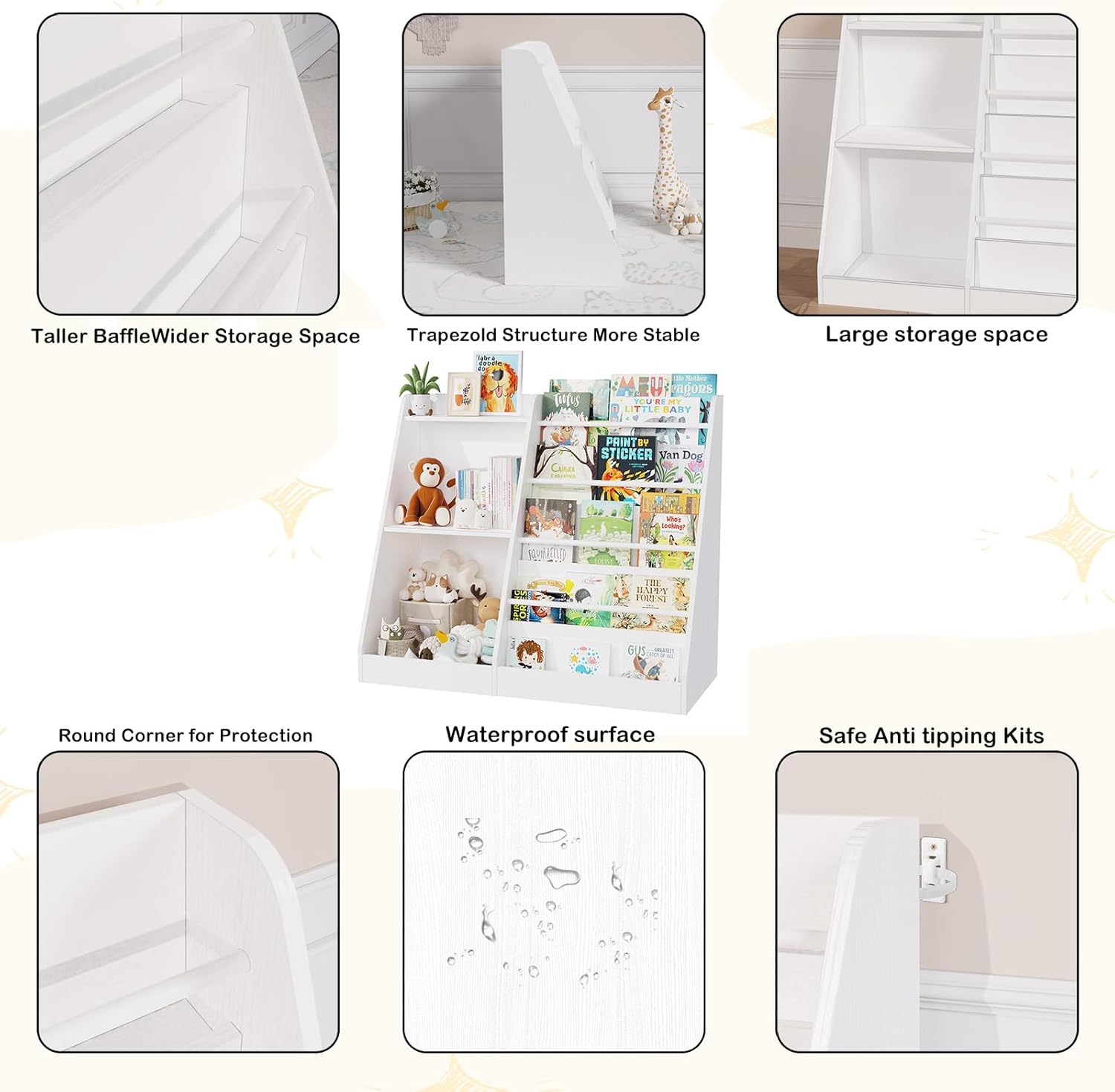 - 【Safety and Stability】The health of you and your family is our top priority. This bookshelf with storage is made from high-quality MDF to create a safe environment for you and your family. We've included anti-tip accessories for added stability. Durable to withstand daily child play/wear and tear. The edges and corners are rounded to protect children from sharp edges