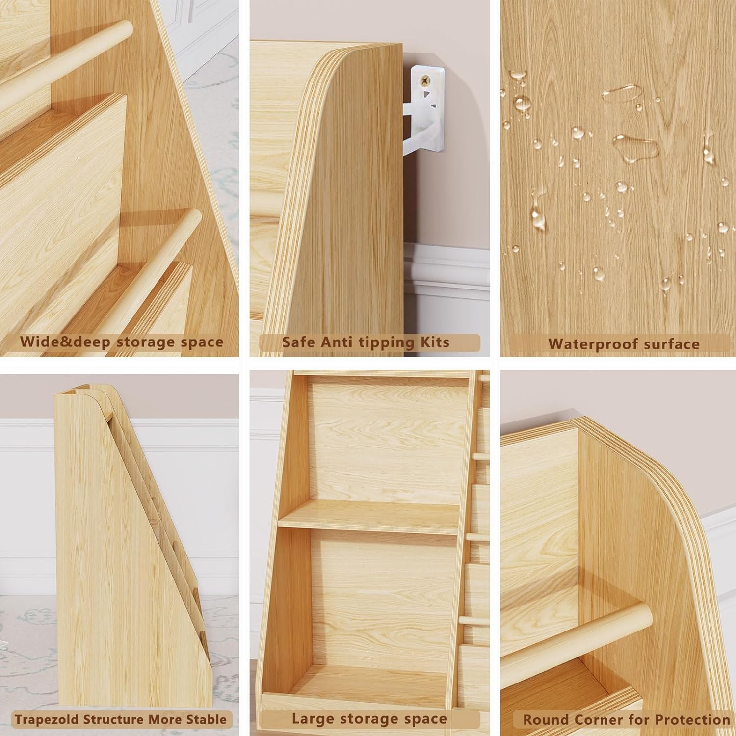 - 【Safety and Stability】The safety of you and your family is our top priority. This bookshelf with storage is made from high-quality MDF to create a safe environment for you and your family. We've included anti-tip accessories for added stability. Durable to withstand daily child play/wear and tear. The edges and corners are rounded to protect children from sharp edges