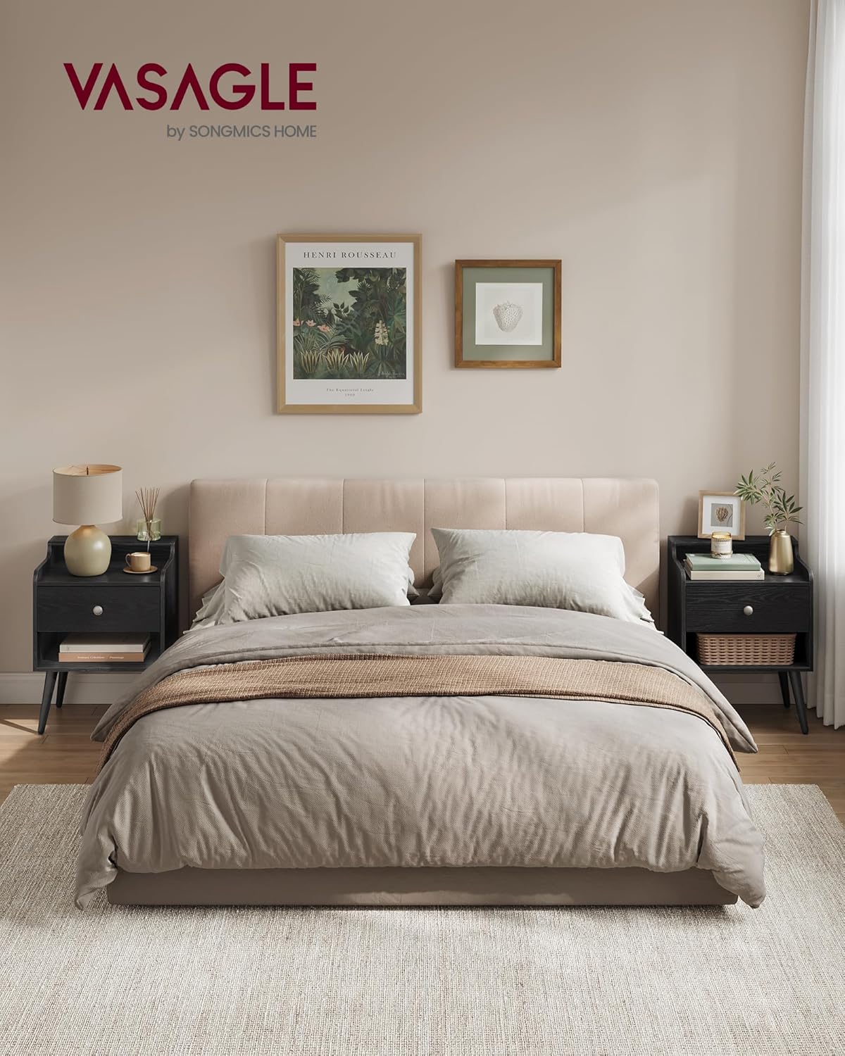 VASAGLE Nightstands, Set of 2, Bedside Tables with Hidden Drawers, Mid-Century End Side Tables with Solid Wood Legs, for Bedroom, Ebony Black ULET624B01