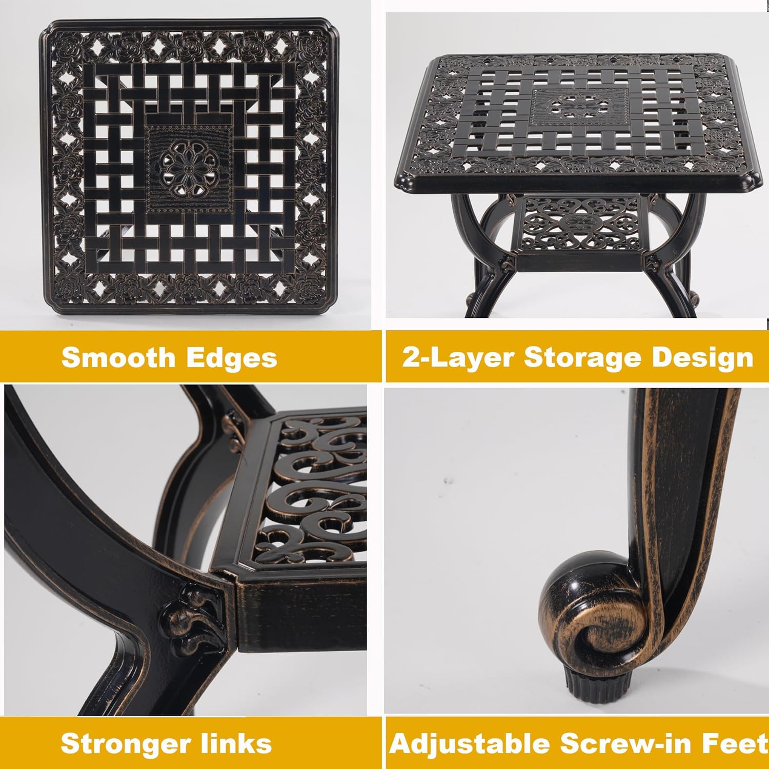- ăHigh Qualityă:Our whole outdoor side table is made of high quality cast aluminum, which is not only sturdy , but also not easy to rust. The four aluminum legs are specially connected to make the table more stable and have a stronger load-bearing capacity. You can use it indoors or outdoors without worrying about corrosion or damage.