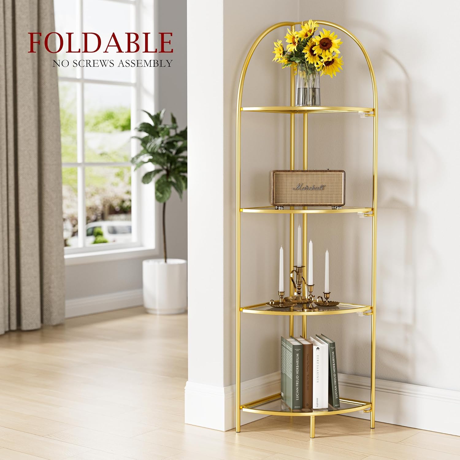 Crofy Foldable 4 Tier Corner Shelf, Metal Corner Plant Stand with Gold Frame and Transparent Shelves, Corner Display Rack Multipurpose Shelving Unit for Living Room, Bedroom, Bathroom