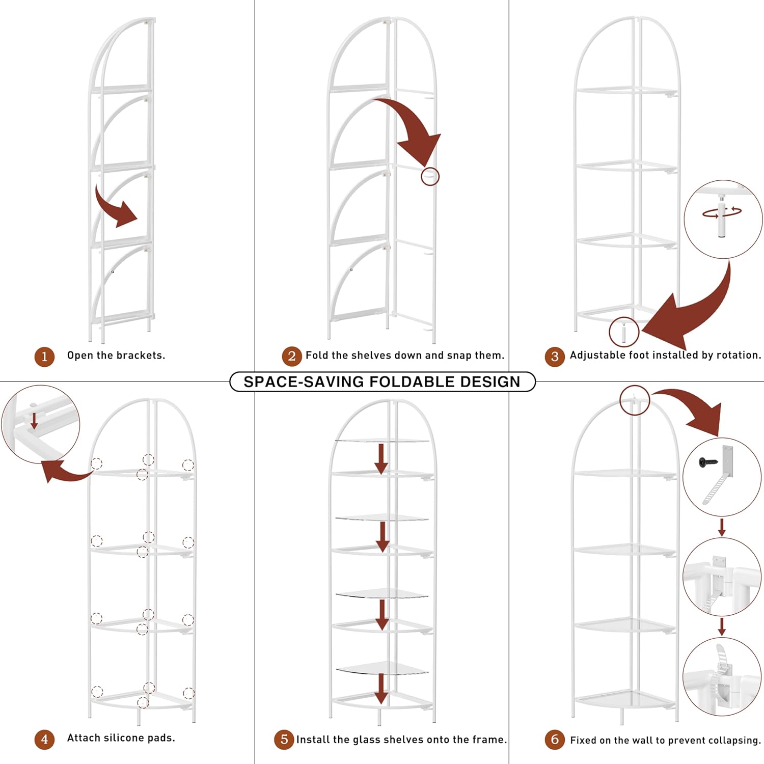 Crofy Foldable 4 Tier Corner Shelf, Metal Corner Plant Stand with White Frame and Transparent Shelves, Corner Display Rack Multipurpose Shelving Unit for Living Room, Bedroom, Bathroom