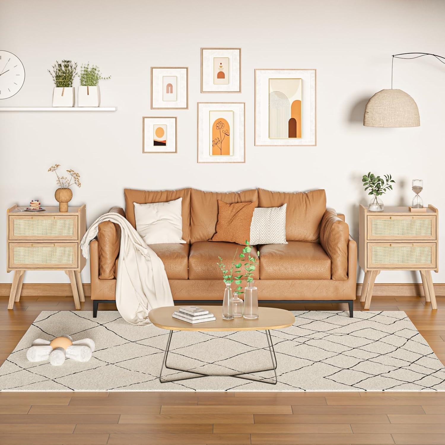 Lerliuo Rattan Nightstands Set of 2, Boho Night Stand with 2 Drawers, Cane Accent Side End Table, Bedside Table with Solid Wood Legs for Bedroom, Dorm and Small Spaces (Natural)