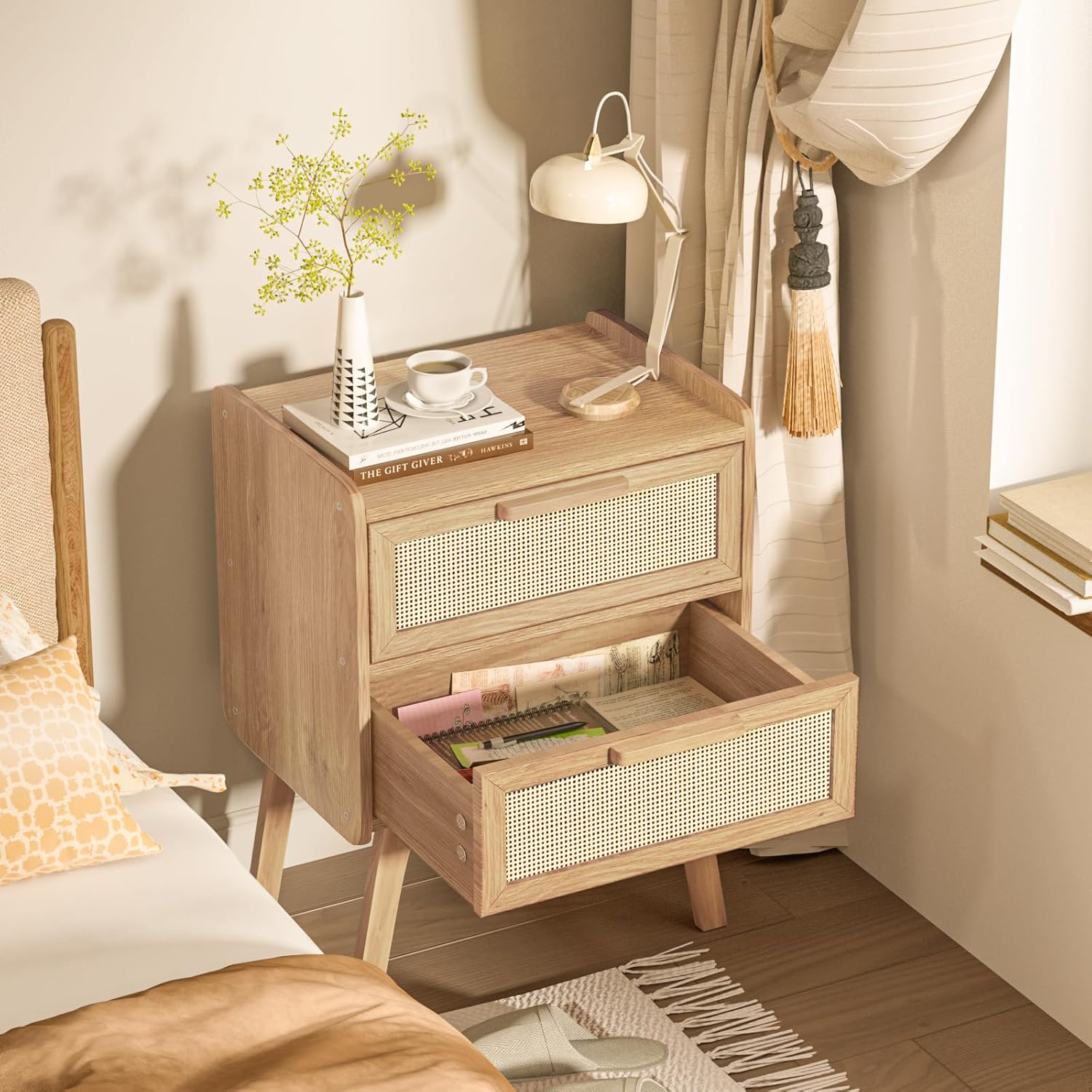 - [Ample Storage & Reliable Material] Spacious desktop with two woven mesh drawers is enough to store your family photos, lamps, books, alarm clocks and more, which can meet your storage needs. The boho side table is made of sturdy wood boards and high quality beech legs, which is sturdy and stable. The light wood nightstand will stay with you for years.
