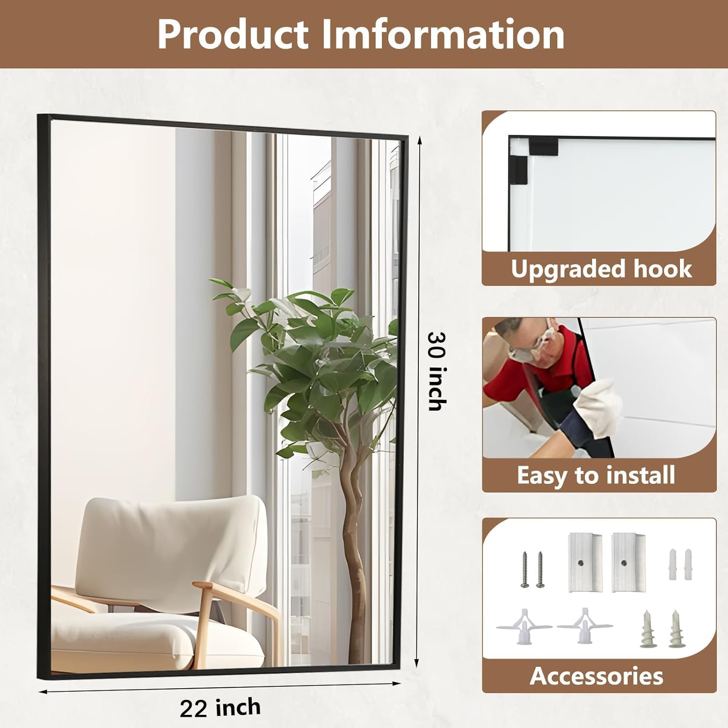 Black Bathroom Mirror, 22"x30" Rectangle Mirror, Matte Black Mirror, Metal Frame Square Corner Vanity Mirror, Wall Mounted Mirror for Modern, Living Room, Bedroom, Horizontal Or Vertical