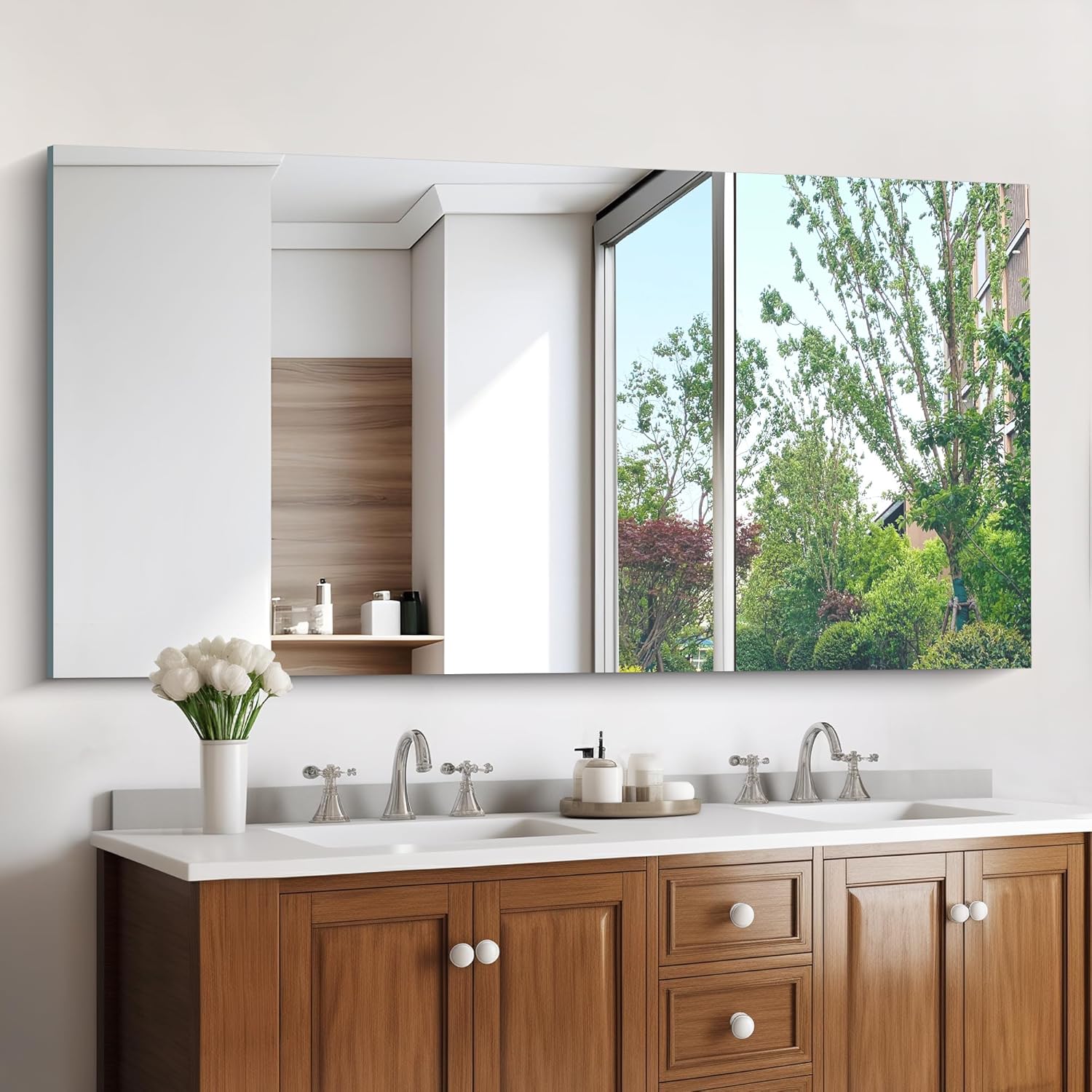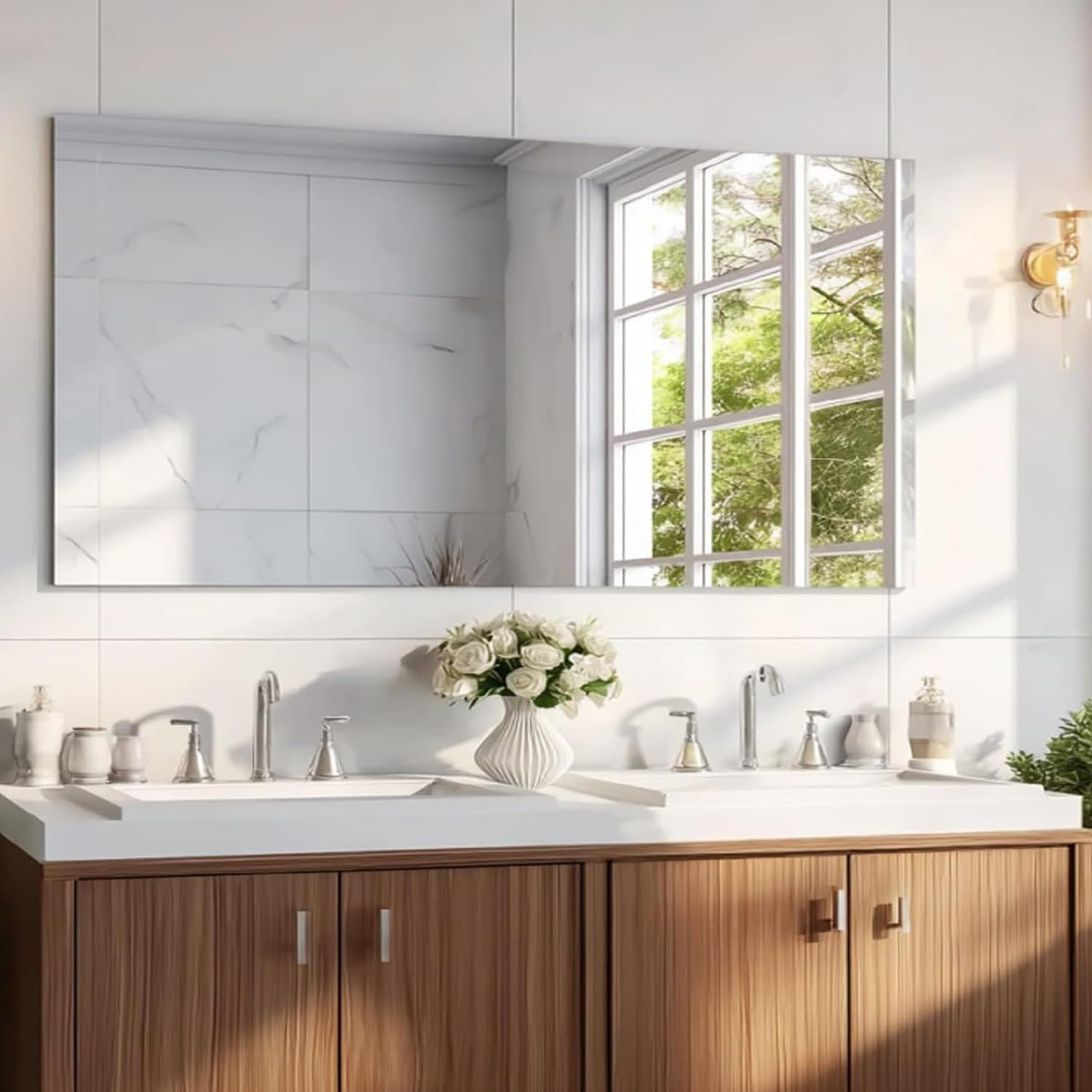 - HD 1:1 Reflection:KOCUUY frameless wall mirror offers a high-definition reflection. The premium mirror backing ensures a 1:1 real reflection with no distortion, giving you an clear and bright visual experience. This unframed mirrors are not only rust-resistant but also promise durability, making them ideal for high-humidity bathroom conditions