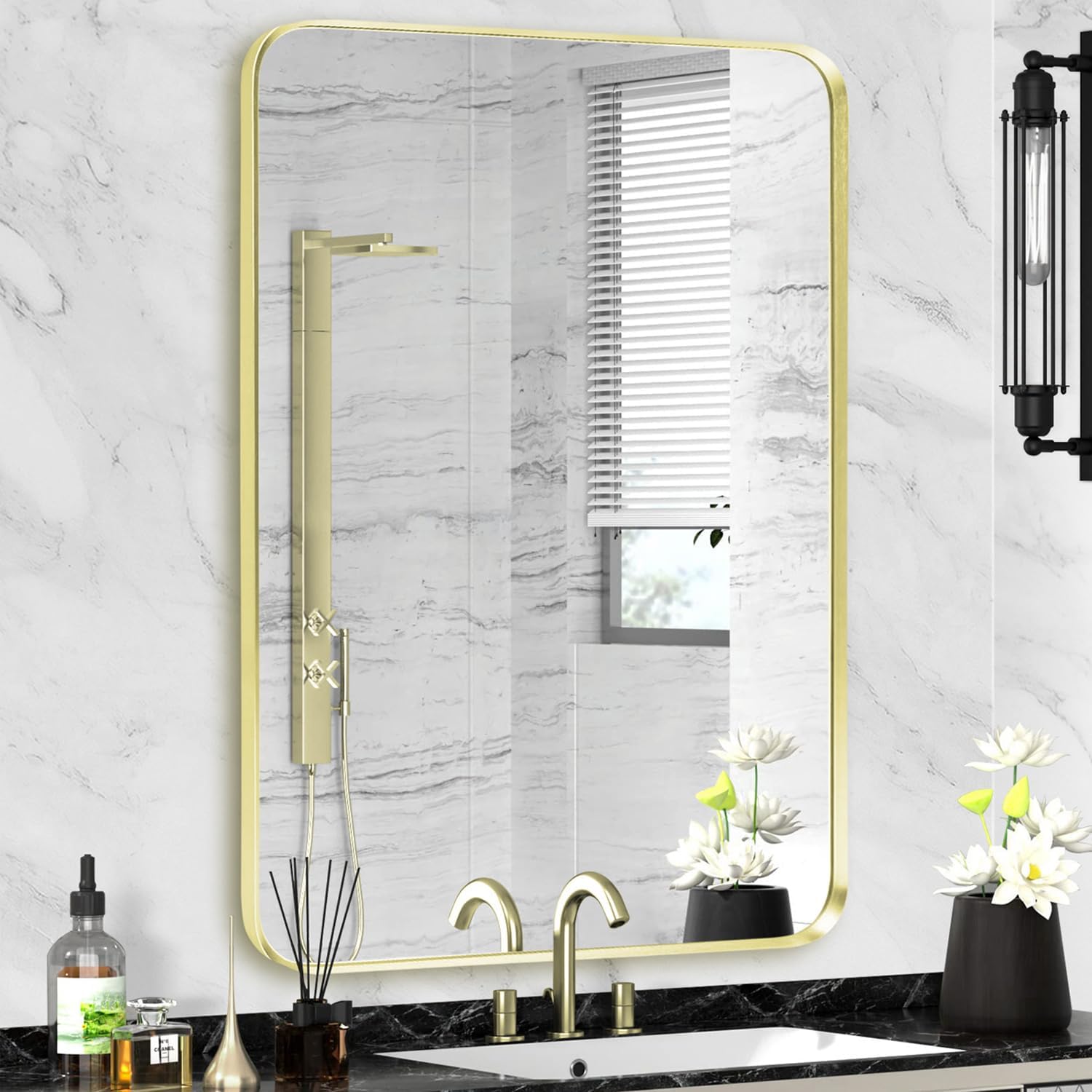 Wall Mount Mirror for Bathroom, Brushed Gold Metal Framed Rounded Corner Rectangular Vanity Mirror, Tempered Glass (28" x 36", Gold)