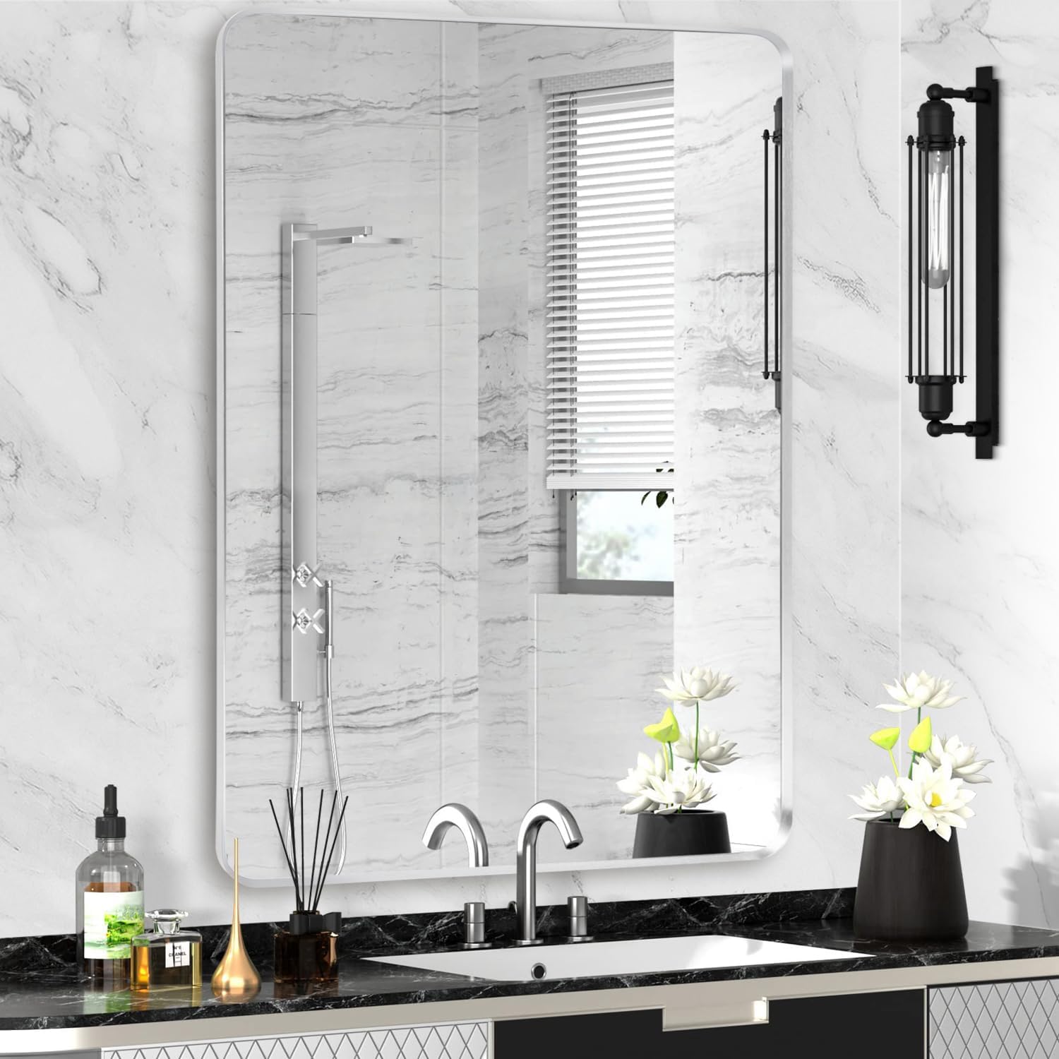 - Useable areas and purpose: Our silver metal mirror adapts seamlessly to various spaces, from the bathroom to the bedroom, living room, dining room, entrance, and even fireplace. From hotels to hair salons. From household to commercial. You can use it with confidence. It serves as both a practical vanity mirror and a chic decorative accent