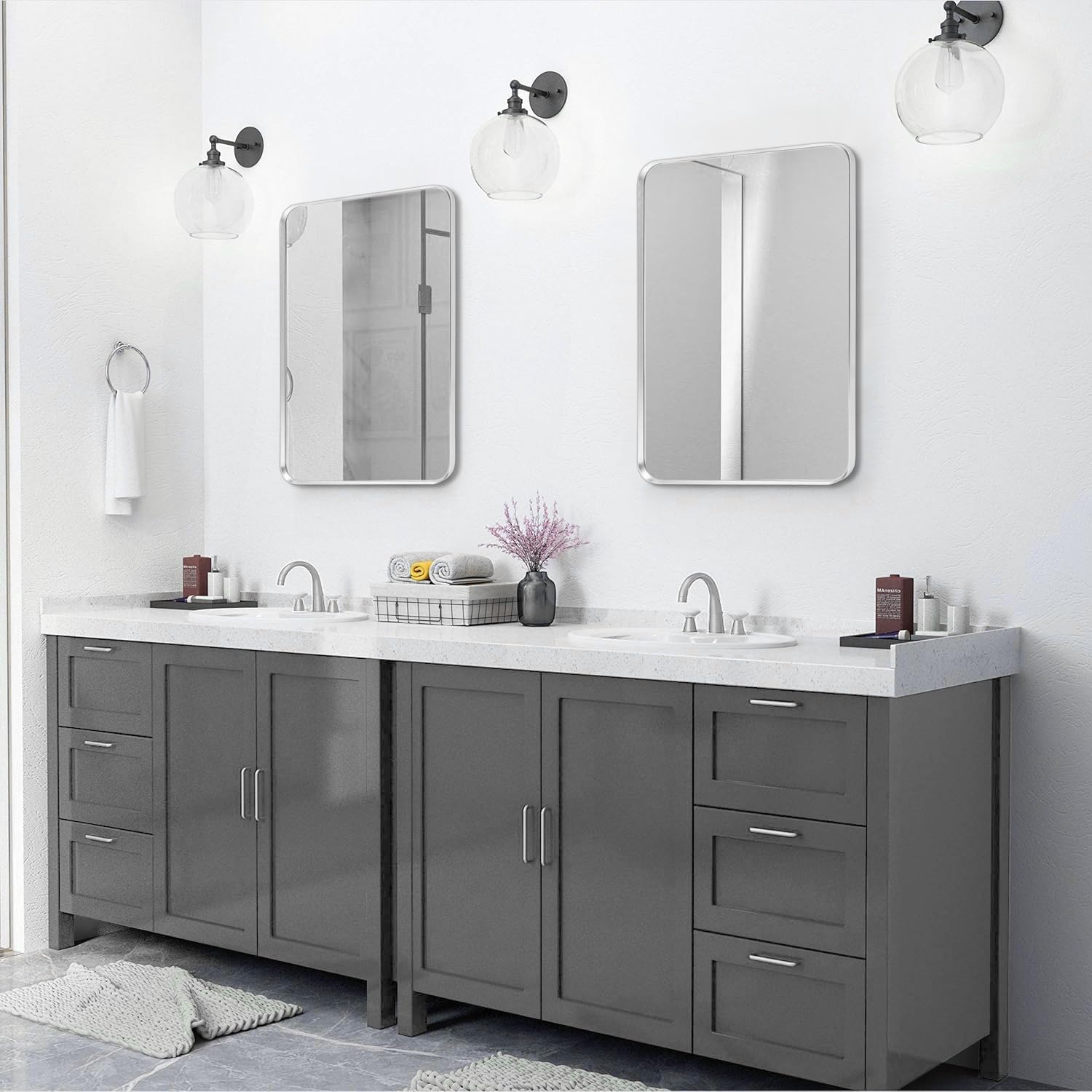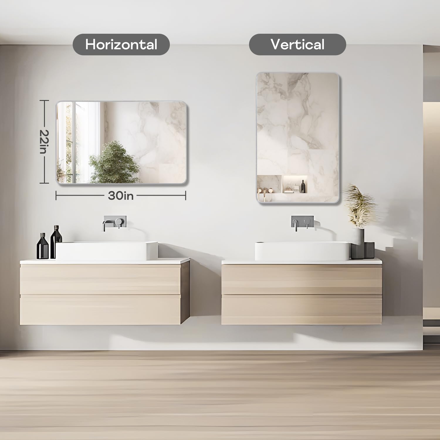 Silver Framed Bathroom Mirror, Brushed Nickel Rounded Corner Rectangle Wall Mirror, Tempered Glass, Shatter Proof, Anti-Rust, Hangs Horizontally or Vertically (22" x 30", Silver)