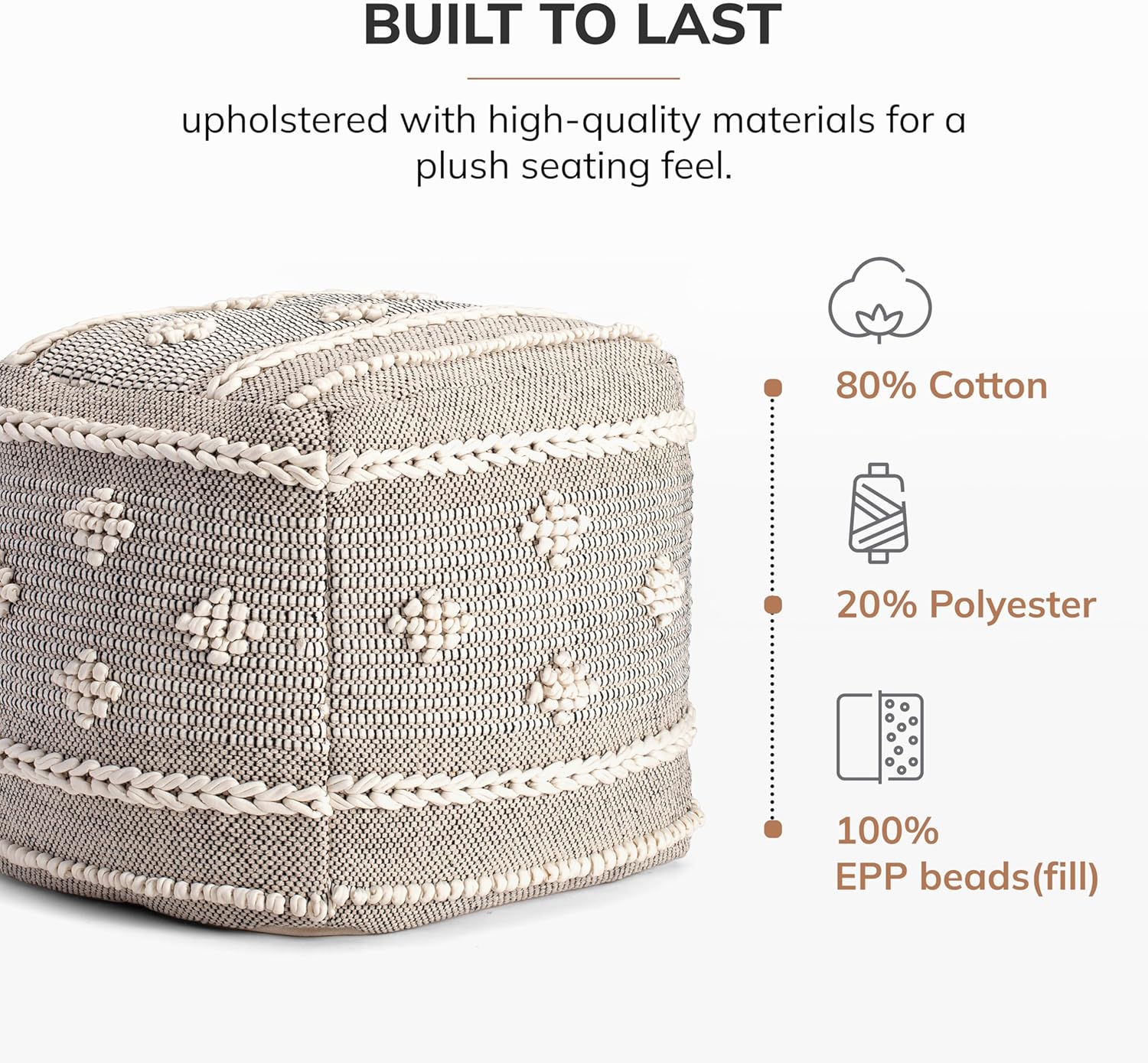 - Crafted using premium materials: Each pouf cover is meticulously handcrafted using premium materials, comprising a blend of 55% cotton and 45% polyester. This combination not only ensures durability but also adds a touch of elegance to any space.