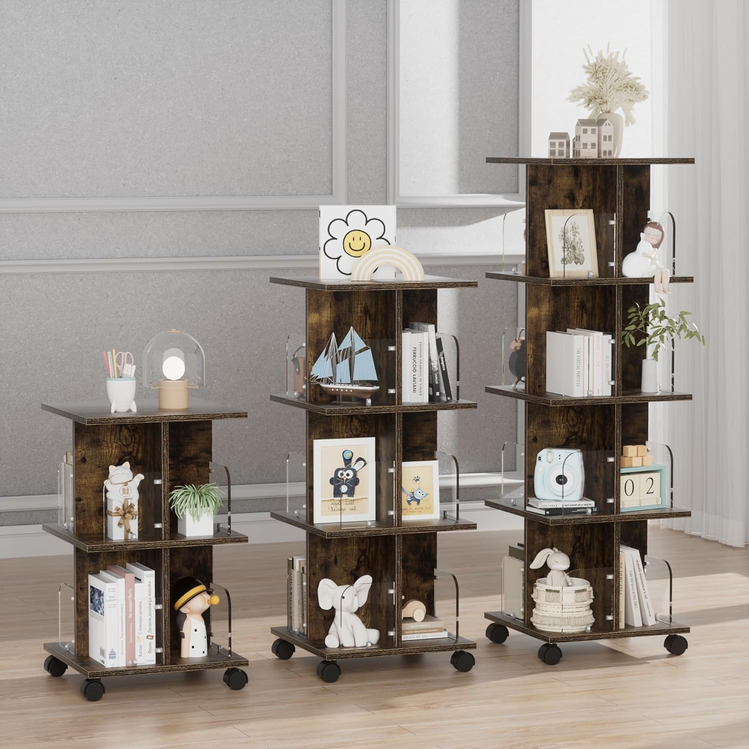 - 🍬【Flexible Use】: You can DIY the bookshelf into a short bookshelf with 3 Tiers, 2 Tiers or 1 Tier, perfect for storing magazine albums or other favorite collectibles in your living room, children's room, den, playroom, bedroom or office. Rotates 360° for easy access from any angle. Perfect for decorating, organizing and storing your belongings while staying neat and organized.