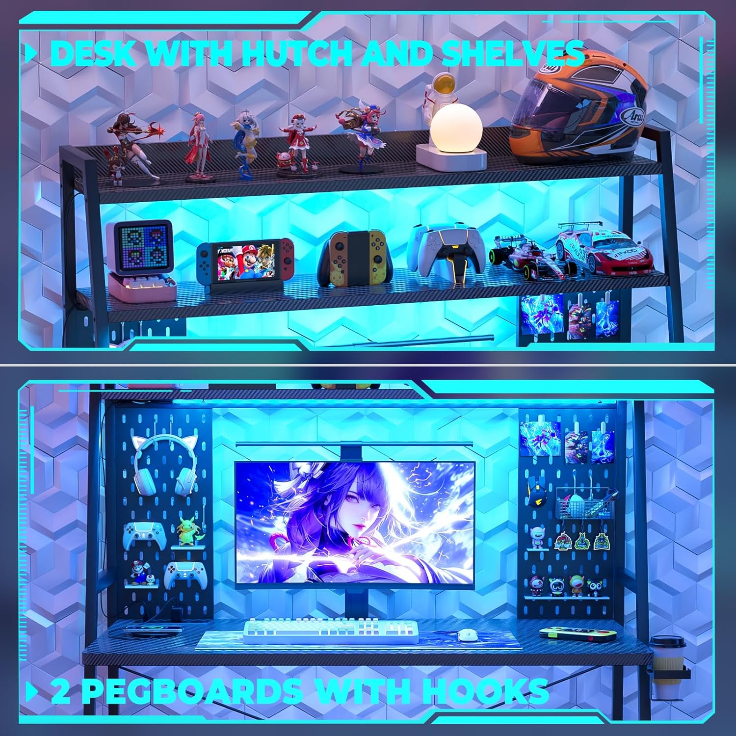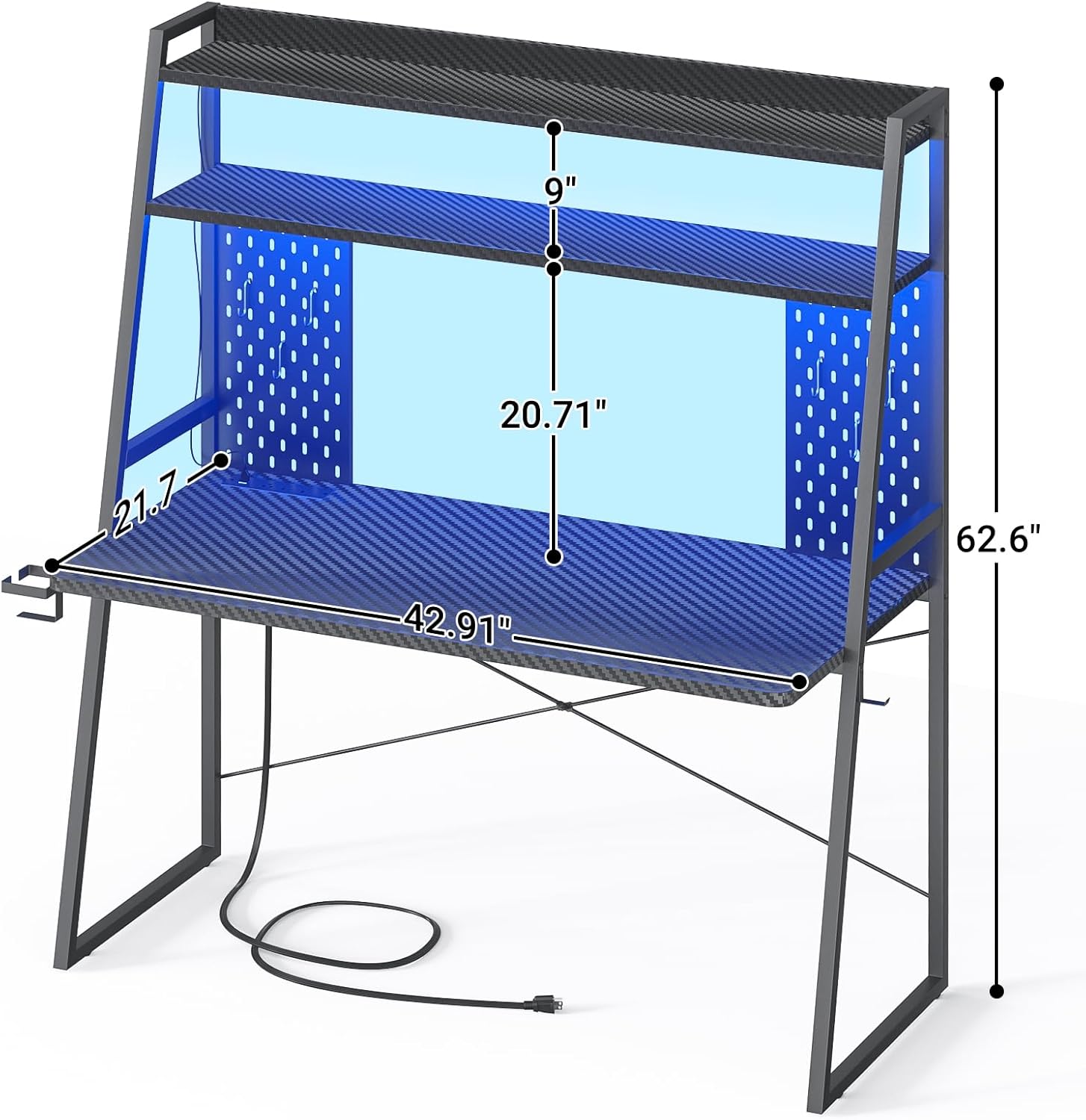 Small Gaming Desk with Hutch and LED Lights, Gaming Computer Desk with Power Outlets, Gamer Desk with Storage Shelves, Game Desks with Pegboards for Bedroom Small Spaces, Black, 43"