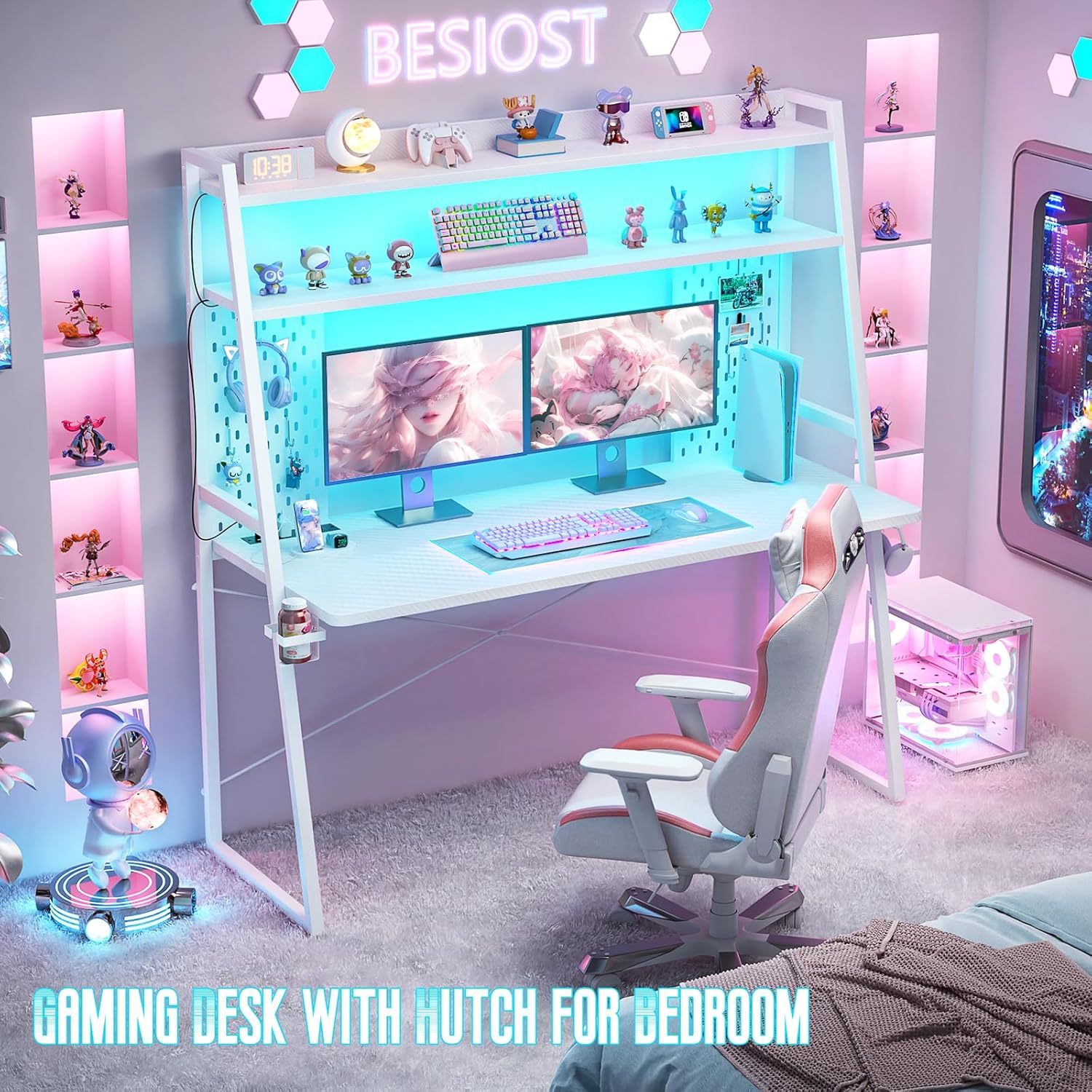 - Space Saving Desk - Besiost gaming desk with hutch is spacious. The main tabletop is almost 22" deep. The hutch with 2 shelves and 2 pegboards(including 6 hooks) is a game changer. You can easily fit your PC, multiple peripherals, cool and beautiful figures, and a bunch of decorative items across all of the shelves and space on the hutch it has. It saves even more space.