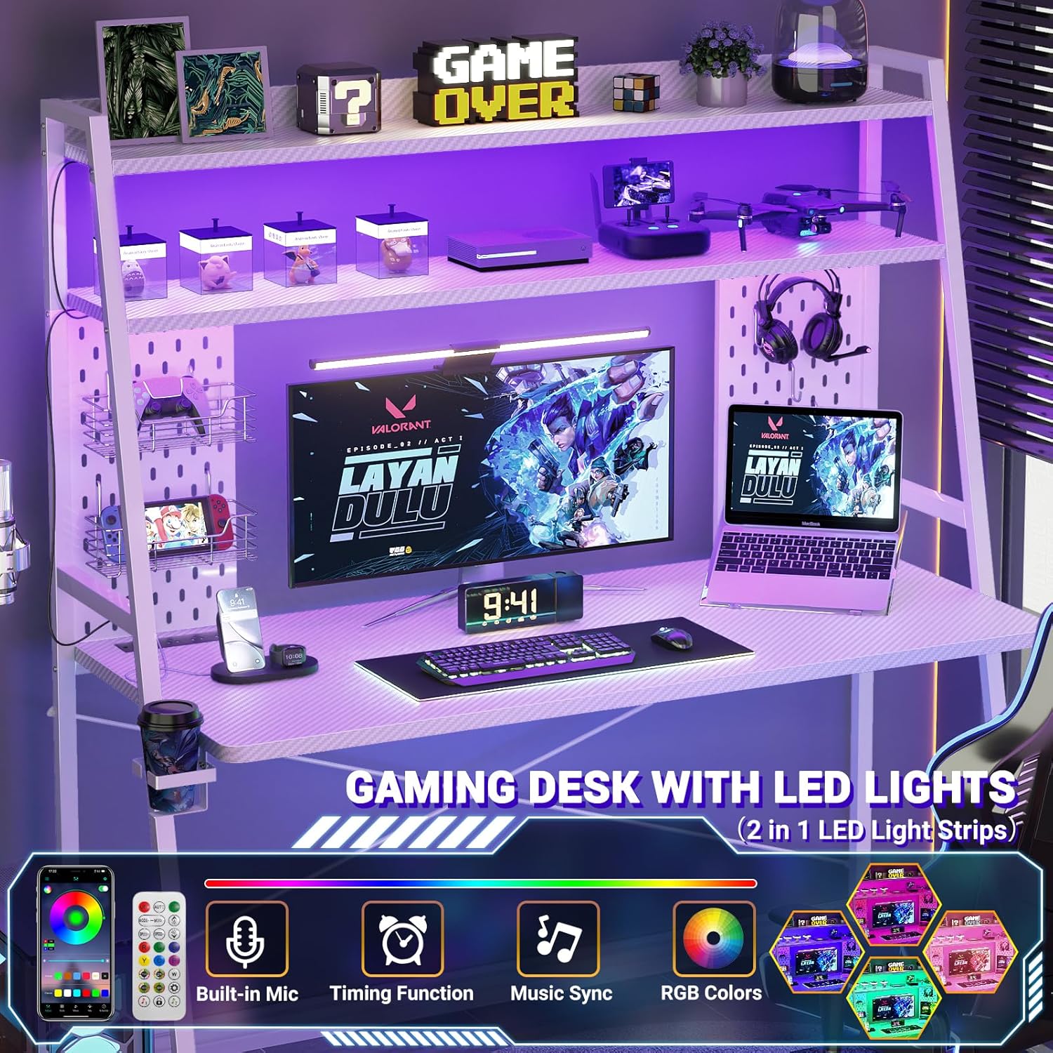 Gaming Desk with Hutch and LED Lights, Gaming Computer Desk with Power Outlets, Gamer Desk with Storage Shelves, PC Game Desk with Pegboards for Bedroom, Carbon Fiber White, 49"