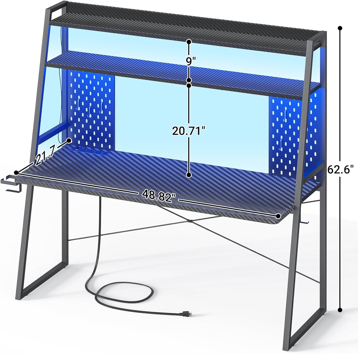 Gaming Desk with Hutch and LED Lights, Gaming Computer Desk with Power Outlets, Gamer Desk with Storage Shelves, PC Game Desks with Pegboards, for Bedroom, Carbon Fiber Black, 49"