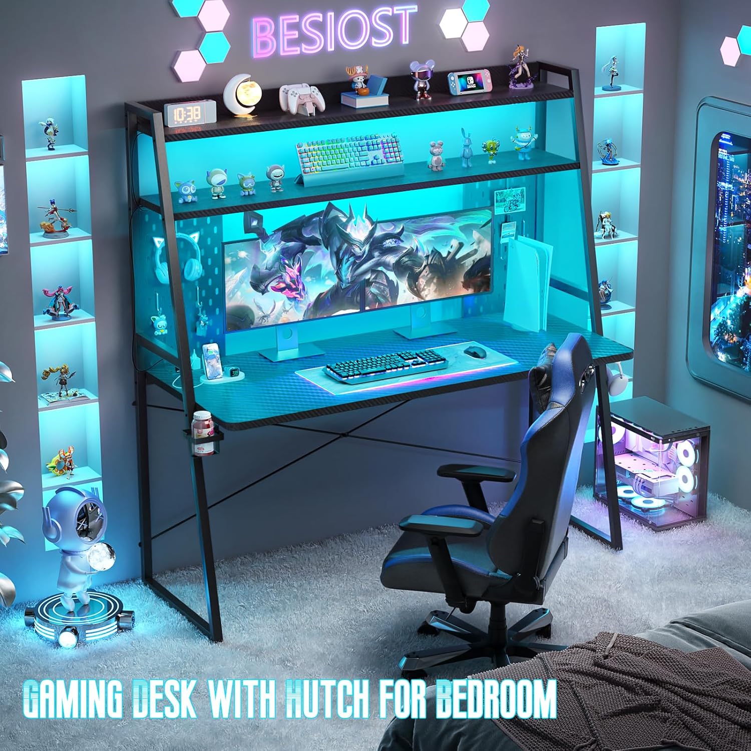 - Space Saving Desk - Besiost gaming desk with hutch is spacious. The main tabletop is almost 22" deep. The hutch with 2 shelves and 2 pegboards(including 6 hooks) is a game changer. You can easily fit your PC, multiple peripherals, cool and beautiful figures, and a bunch of decorative items across all of the shelves and space on the hutch it has. It saves even more space.