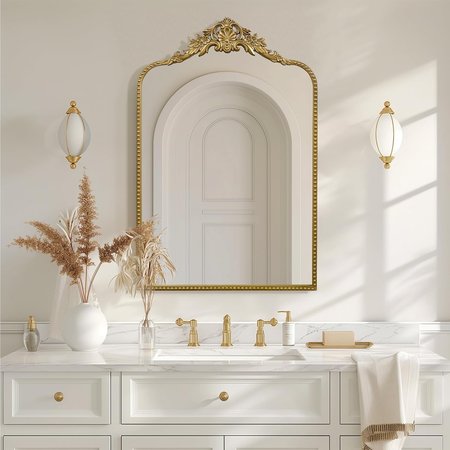 - Barque Style- Its ornate design, antique gold finish, and impeccable craftsmanship make it the perfect addition to any room. A statement piece that combines antique elegance with modern style. French country mirror will suitable for fireplace, bathroom, entryway, living room, bedroom, powder room, hall,and more.