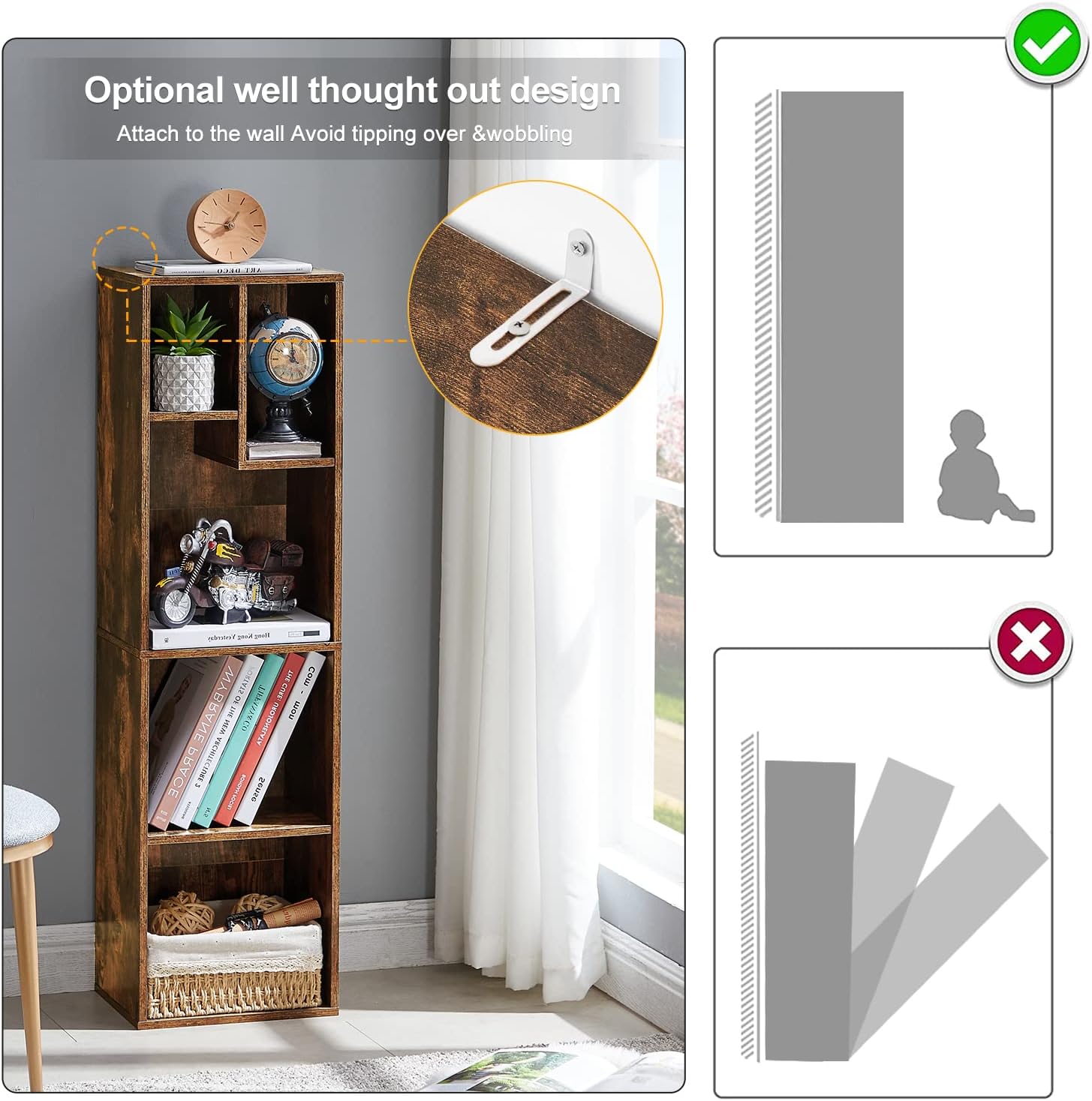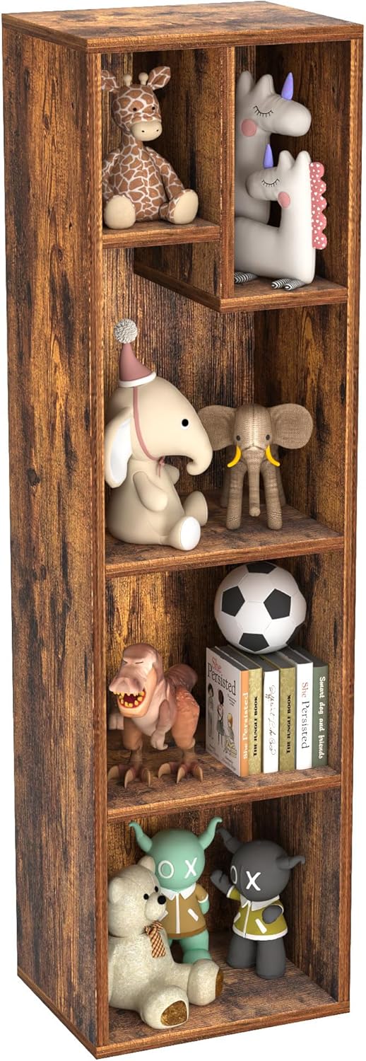 VECELO Small Bookshelf, 5 Cube Slim Bookcase, Fits Tallest Hardcovers, Horizontal Available, Modern Floor Standing Unit, Each Shelf Hold Up to 66 LBS, Vintage Brown