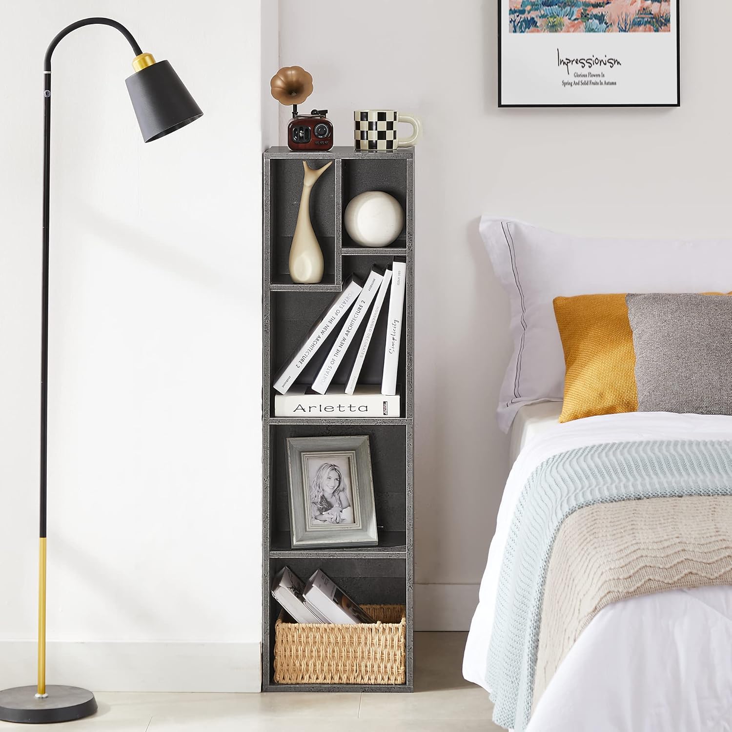 VECELO Small Bookshelf, 5 Cube Slim Bookcase, Fits Tallest Hardcovers, Horizontal Available, Modern Floor Standing Unit, Each Shelf Hold Up to 66 LBS,Modern Gray